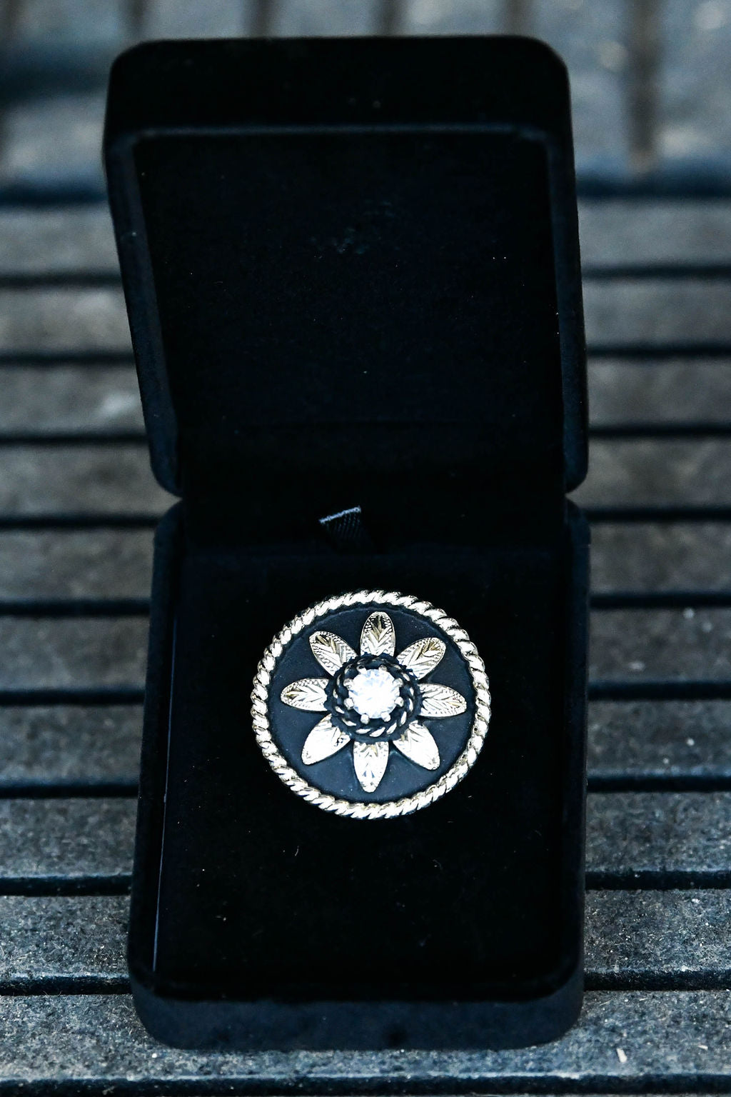 Handcrafted by our own silversmith, this Bling Daisy Concho from Hannah's Silver line. It's detailed design adds a polished touch to your chaps or accessories, reflecting quality and style that lasts.
