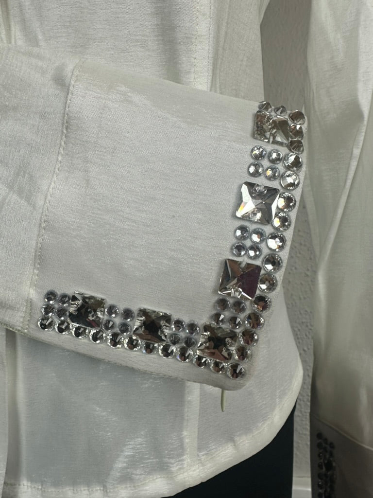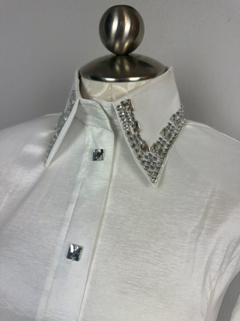 Experience the bold and beautiful White 'color on color' show shirt! This stretch taffeta dress is perfect for any occasion. The hidden zipper keeps the look sleek and effortless. Make a statement in this must-have top!