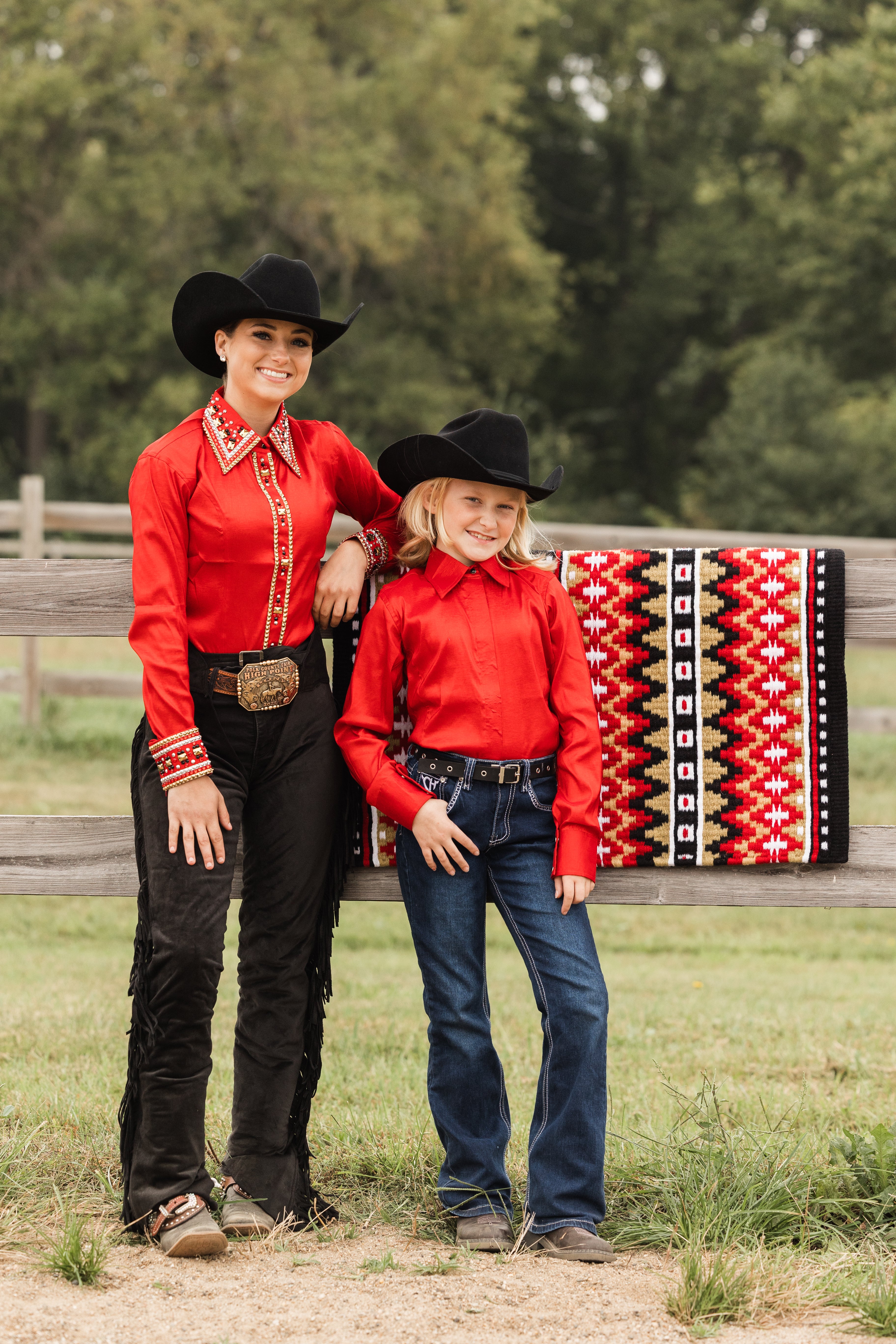 Looking to make a statement in the show arena? Our Ladies Bling Show Shirt in Red and Gold is the perfect choice. Made to be form fitting, this shirt not only looks stunning but also allows for ease of movement during your performance. Perfect for showing in, this show shirt will definitely turn heads!