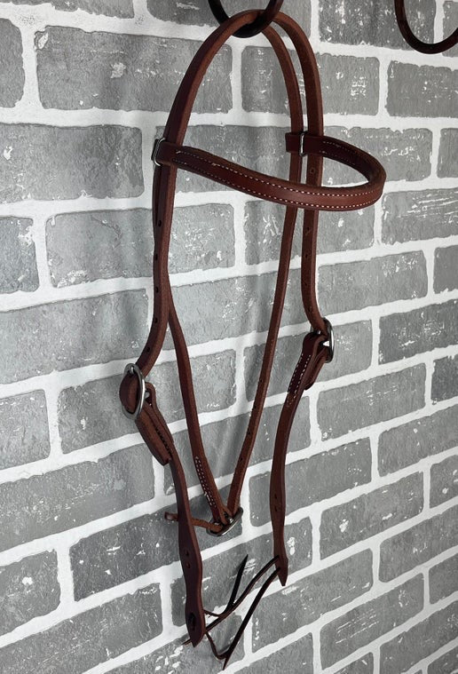 Beautifully hand crafted in the USA using only Hermann Oak Leather. Double stitching on the browband to ensure long lasting durability. Solid brass hardware with tie ends.