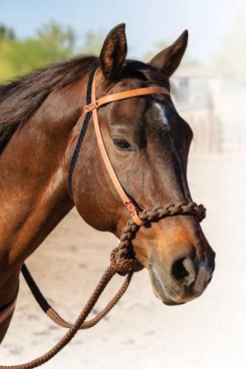 Perfect for loping, the 4-plait chocolate brown noseband is soft and comfortable for the horse but has enough feel to do the job. Hand laced harness leather headstall with stainless steel buckle, nylon fiador. 17 ft chocolate poly braided rein has a good grip and feel in any conditions.