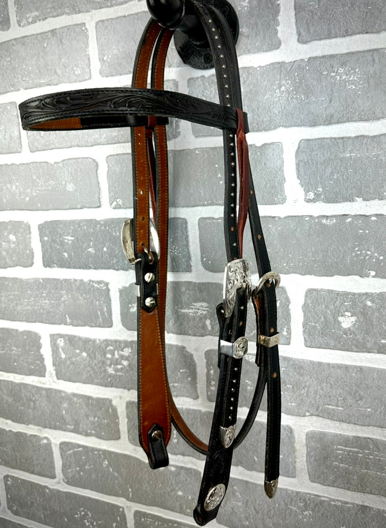 This gorgeous hand crafted TM Leather headstall is a just what you need to complete the look! From the beautiful silver, to the hand carved leather, to literally every detail. This black headstall is made in the USA.
