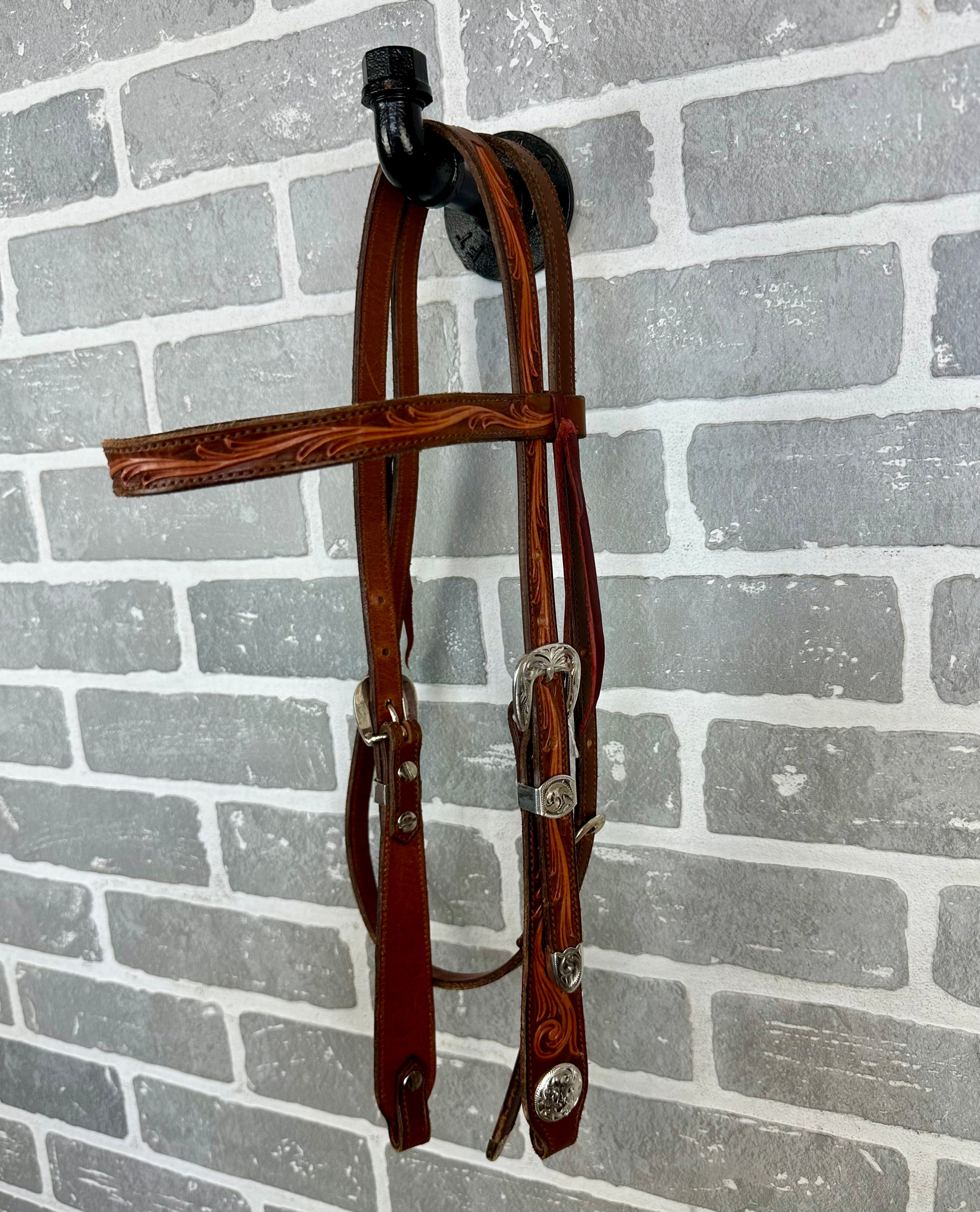 This gorgeous hand crafted TM Leather headstall is a just what you need to complete the look! From the beautiful silver, to the hand carved leather, to literally every detail. This headstall features two tones of brown within it and is made in the USA.