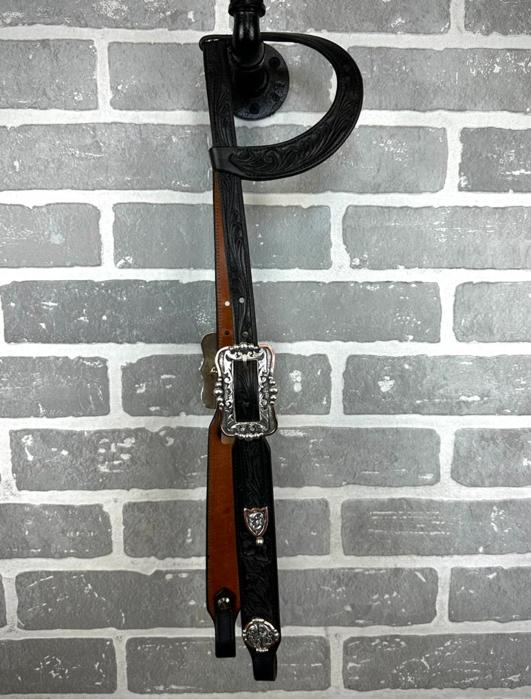 This gorgeous hand crafted TM Leather headstall is a just what you need to complete the look! From the beautiful silver, to the hand carved leather, to literally every detail. This black headstall is made in the USA.