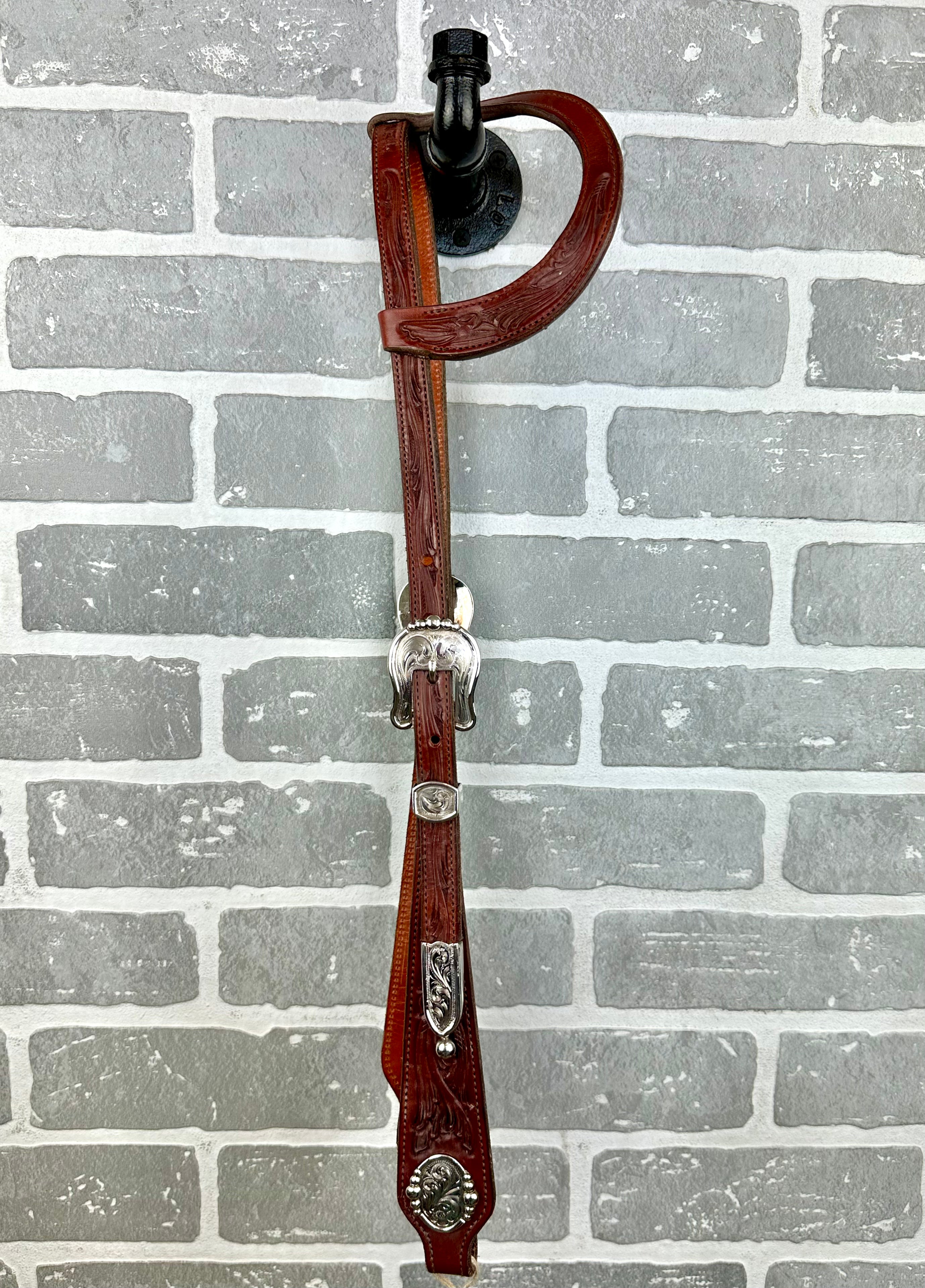 This gorgeous hand crafted TM Leather headstall is a just what you need to complete the look! From the beautiful silver, to the hand carved leather, to literally every detail. This brown headstall is made in the USA.