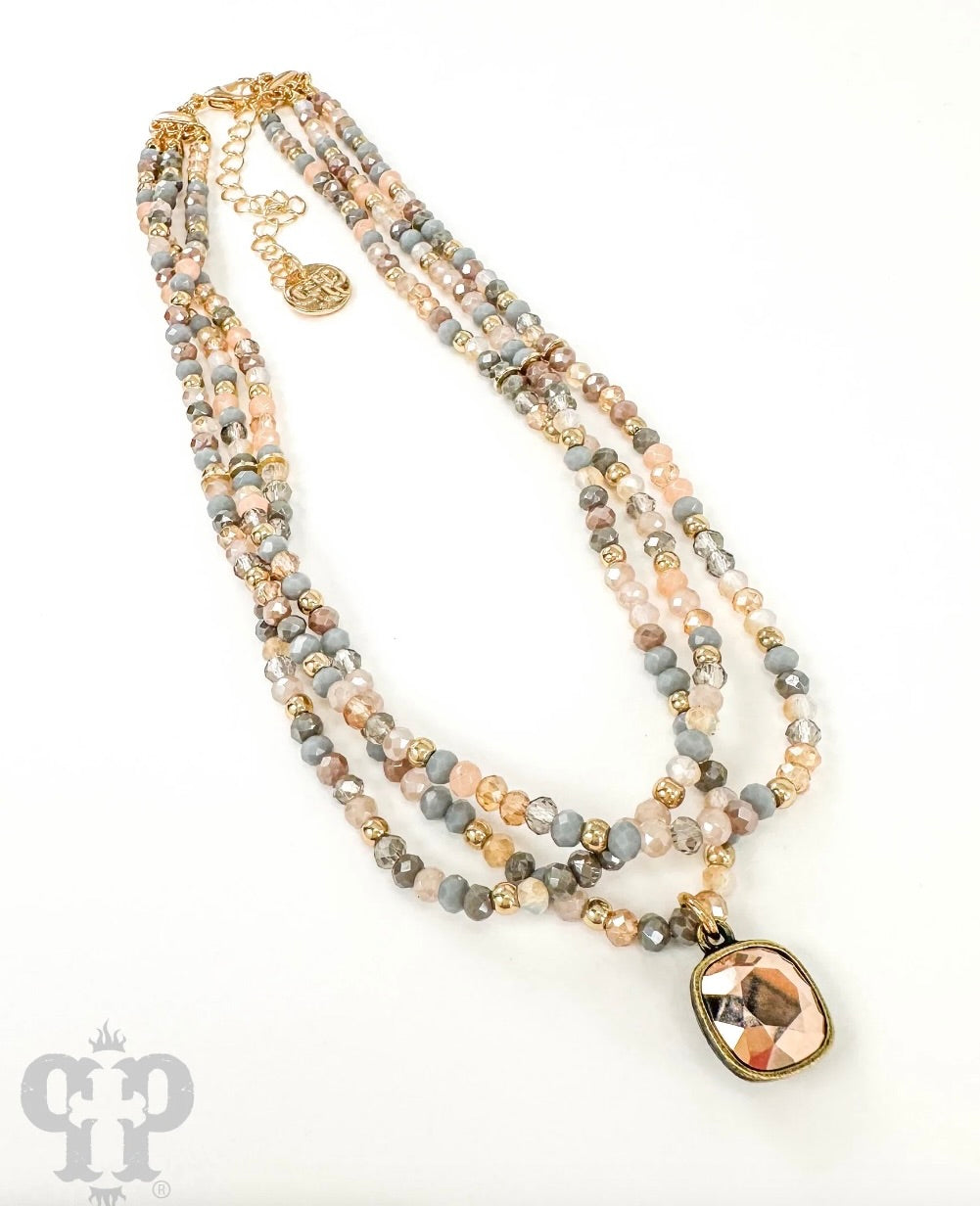 This three strand choker necklace features gray, blush and gold beads and 10mm rose gold Austrian crystal cushion cut drop. Approximately 13.5 inches in length with extender chain.