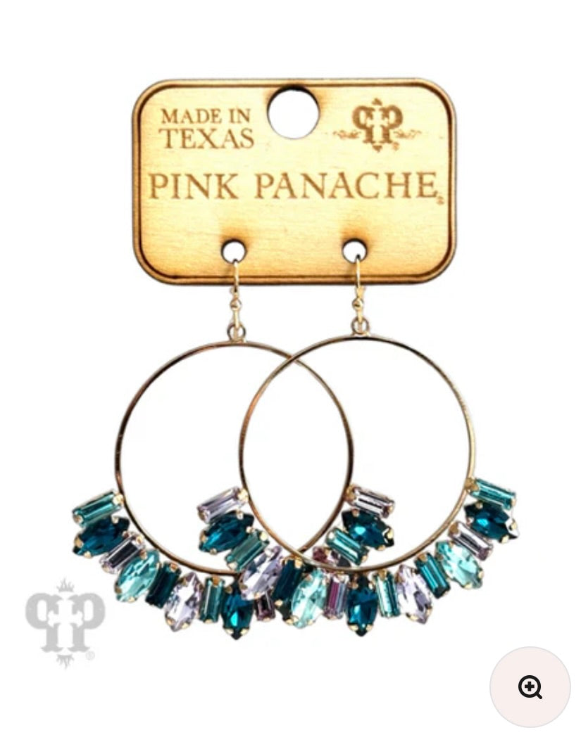 Gold circle earring with blue mix baguette rhinestones. Approximately 2.5 inches in length.