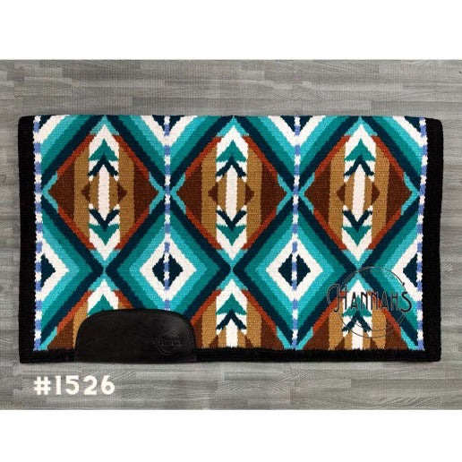 Our custom Ranch pads are hand made with a tight weave that measures 32x40 in size, weighing approximately 7 lbs, 1/2” thick, and stamped wear leathers that are sown on. Each of these show pads also comes with a FREE clear zipper case. This pad features a Black boarder with Chocolate brown, Tan, Tea, Aqua, Navy, Periwinkle, Rust and White within the pattern.