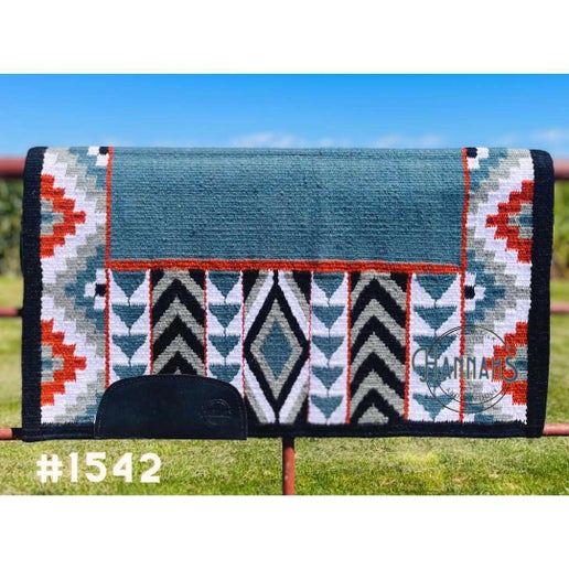 Our custom Ranch pads are hand made with a tight weave that measures 32x40 in size, weighing approximately 7 lbs, 1/2” thick, and stamped wear leathers that are sown on. Each of these show pads also comes with a FREE clear zipper case. This pad features a Black base with Rust, light and dark Gray, Tan, Black, and White within the pattern.