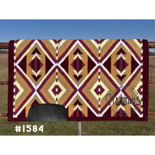 Our custom Ranch pads are hand made with a tight weave that measures 34x40 in size, weighing approximately 5-6 pounds, 1/2” thick, and stamped wear leathers that are sown on. Each of these show pads also comes with a FREE clear zipper case. This pad features a Burgundy base with Plum, Sand, Buckskin, soft Yellow and White within the pattern.