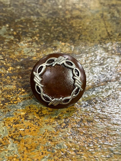 This rust colored base has the silver barbed wire overlay. 1 1/2" wide, by Hansen silver. Sure to accessorize any wild rag.