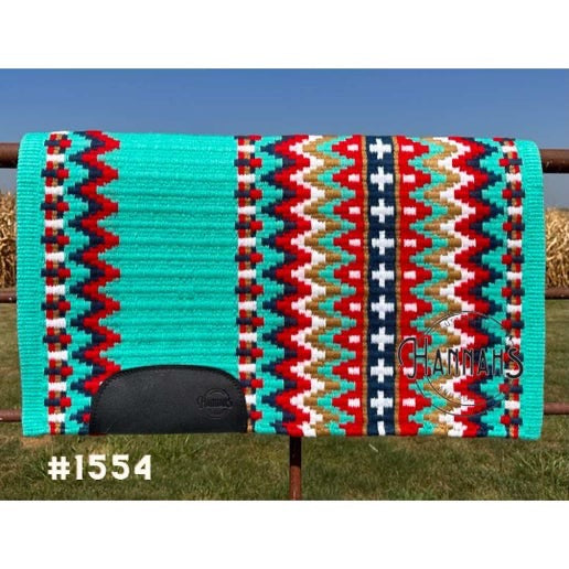 Our custom Show pads are hand made with a tight weave that measures 34x42 in size, weighing approximately 7.5-9 lbs, 3/4” thick, and stamped wear leathers that are sown on. Each of these show pads also comes with a FREE clear zipper case. This pad features a Aqua base with Teal, Red, Buckstitch and white within the pattern.