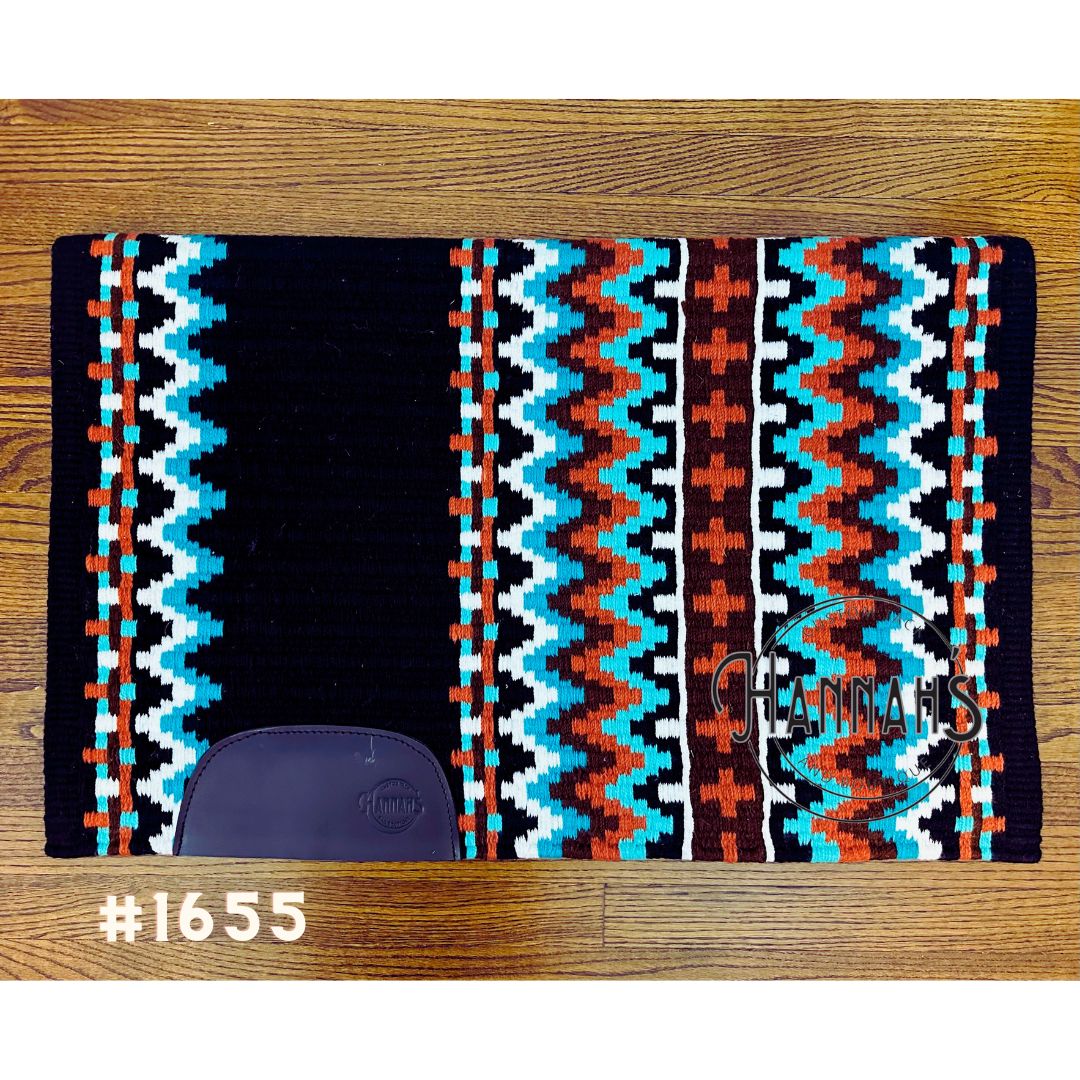 Our custom Show pads are hand made with a tight weave that measures 34x42 in size, weighing approximately 9 lbs., 1/2” thick, and stamped wear leathers that are sown on. Each of these show pads also comes with a FREE black pad bag with window. This pad features a Black base, with Rust, Chocolate, light and dark Turquoise, and White within the pattern.