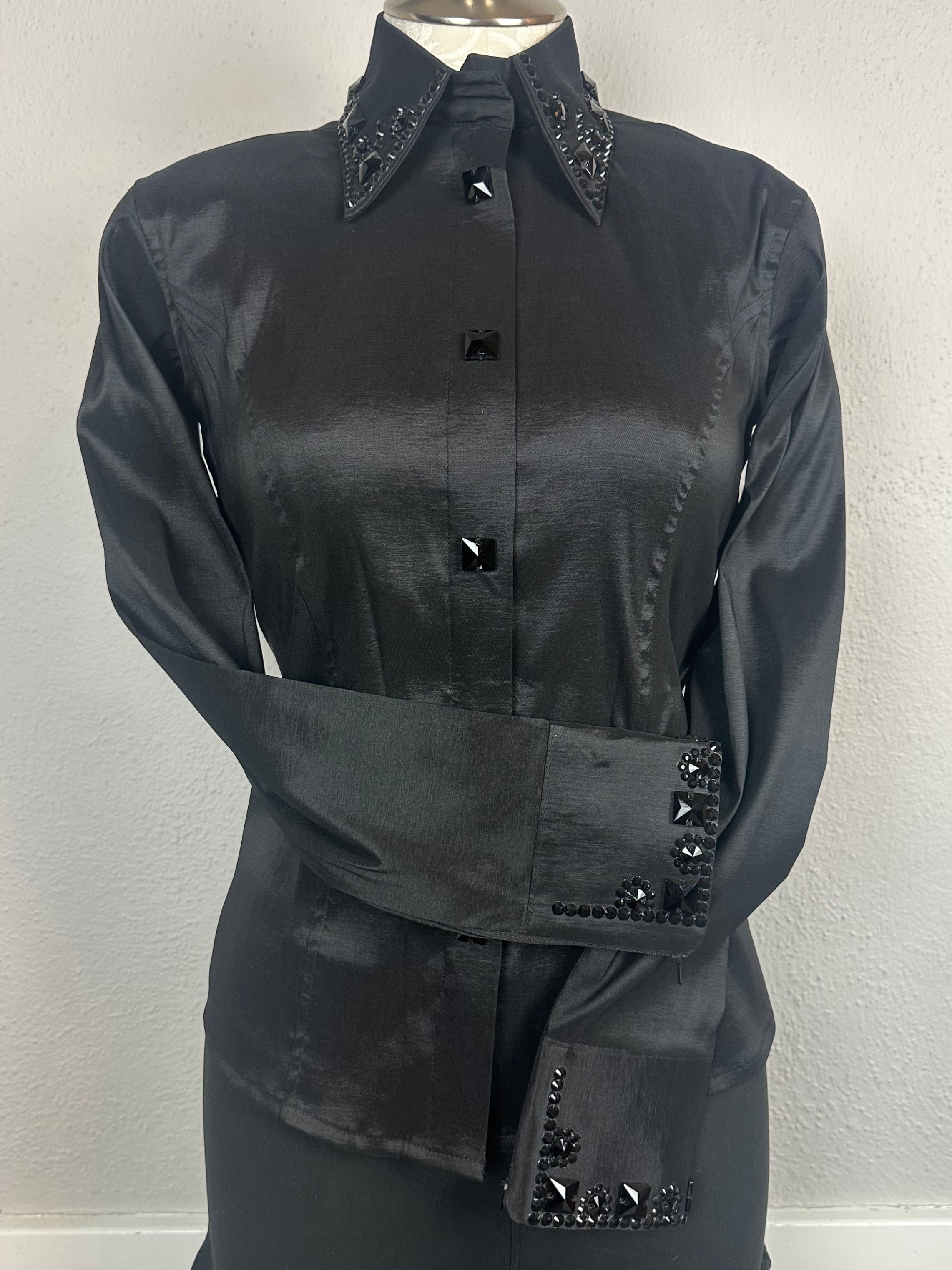 Experience the bold and beautiful Black 'color on color' show shirt! This stretch taffeta dress is perfect for any occasion. The hidden zipper keeps the look sleek and effortless. Make a statement in this must-have top!