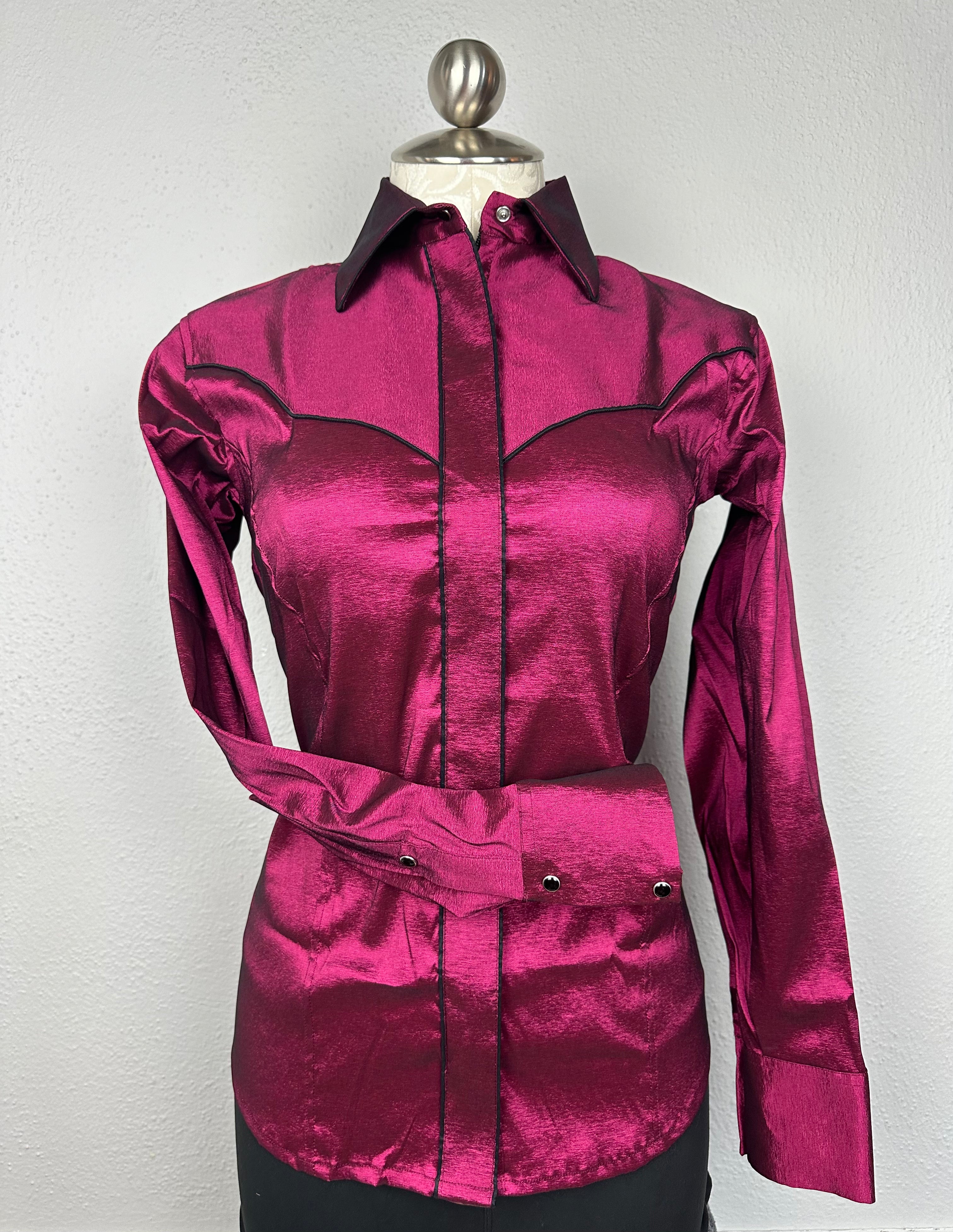 These gorgeous stretch taffeta tops have a great two-tone effect as you move; add a little shine, without the bling; has a great structure; and perfect for all day wear in ranch, reining, or bling up yourself for pleasure. All come with a hidden zipper. Snaps on the cuff and collar. True to size. Merlot base with Black piping. Available in sizes: XS, S, M, L, XL, XXL (XS is equivalent to youth Large)
