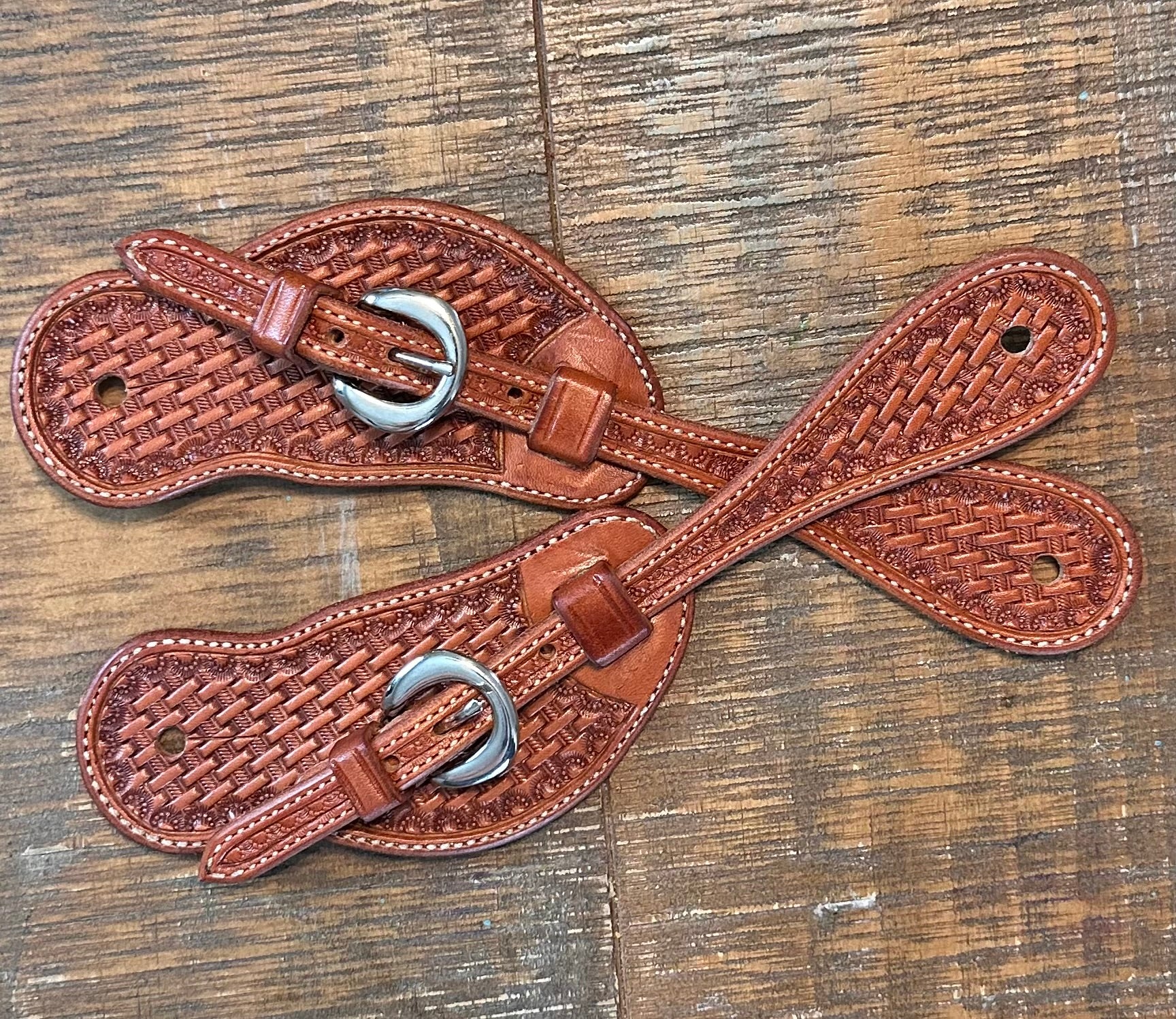 These beautifully hand crafted spur straps are made here in US by one of our own artists. The quality and craftsmanship is 2nd to none! This pair is a light oil for ladies with stainless buckles. Youth size.