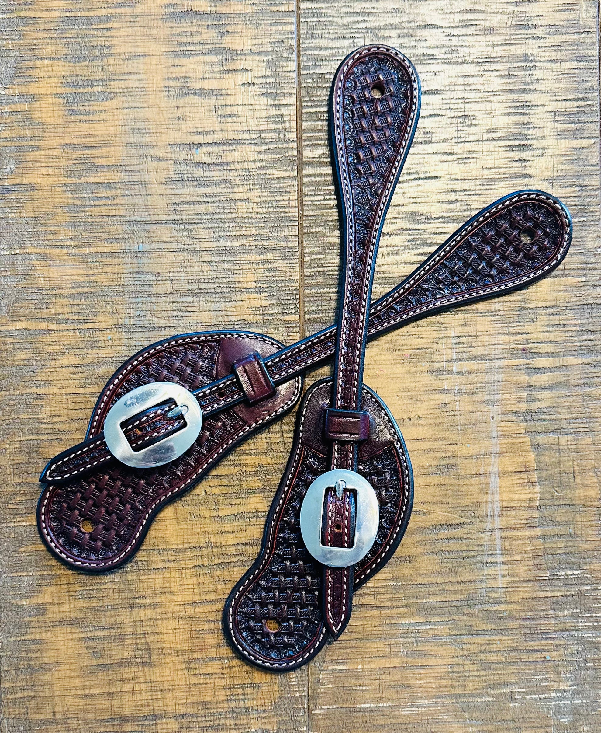 These beautifully hand crafted spur straps have a basketweave pattern stamped by one of our own artists. The quality and craftsmanship is 2nd to none! This pair is a dark brown with black edging, and stainless buckles. Fits most sizes.