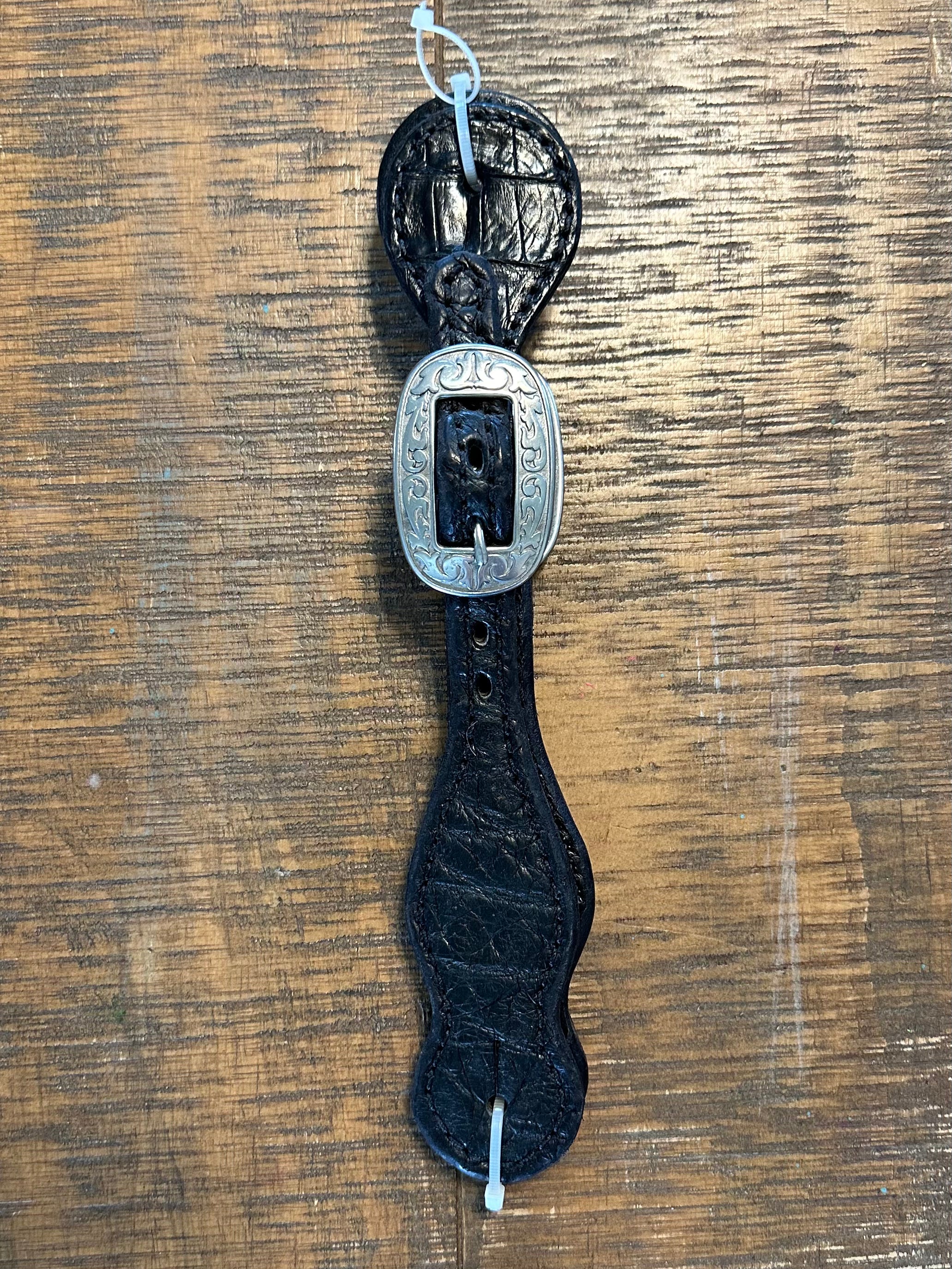 These beautiful Miguel Aguilar spur straps are made here in US by one of their talented artists! The quality and craftsmanship is 2nd to none! This pair is a black exotic overlay with stainless steel buckles. Fits most sizes.
