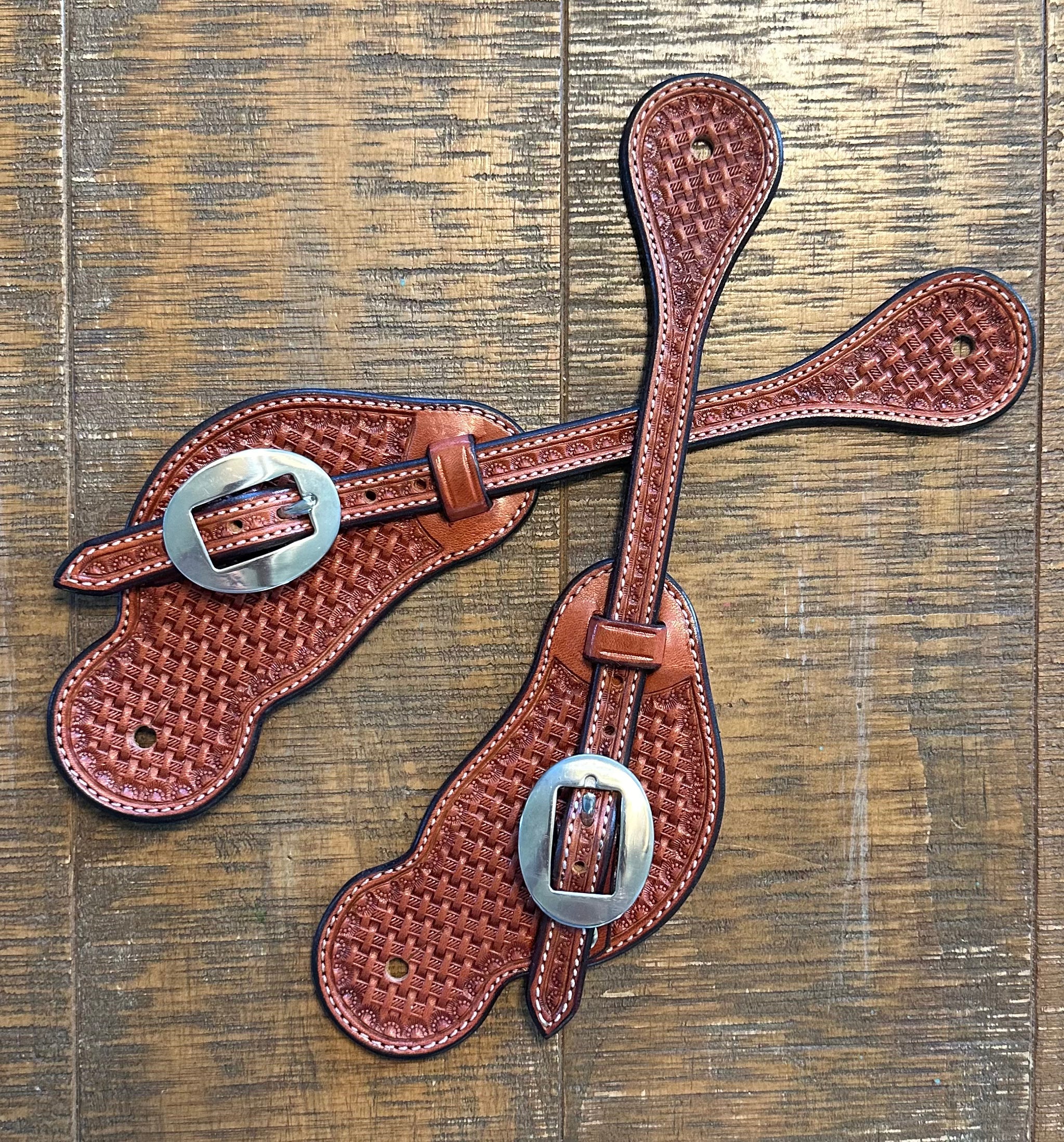 These beautifully hand crafted spur straps have a basketweave pattern stamped by one of our own artists. The quality and craftsmanship is 2nd to none! This pair is a light brown with stainless buckles and fits most sizes.