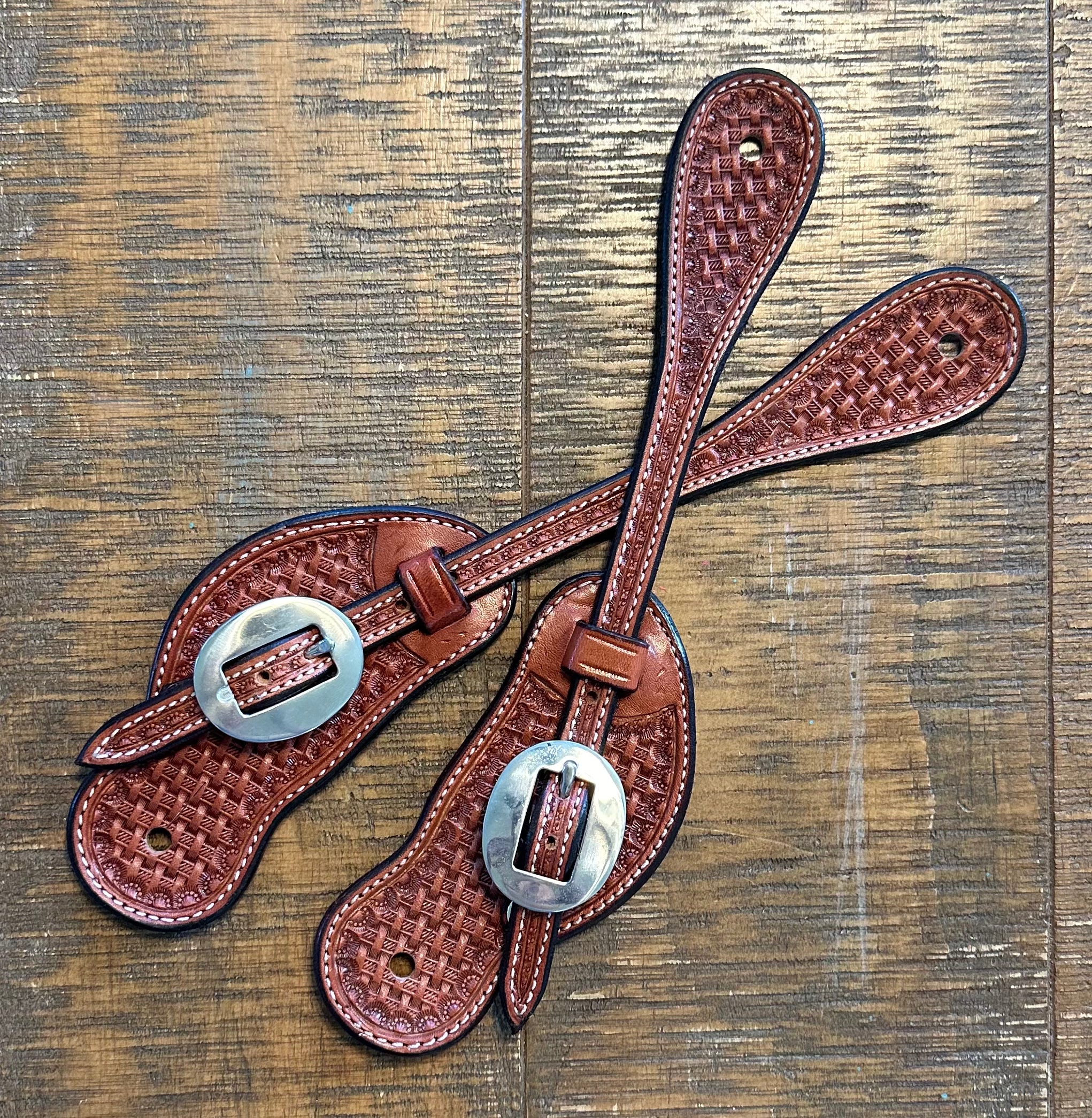 These beautifully hand crafted spur straps have a basketweave pattern stamped by one of our own artists. The quality and craftsmanship is 2nd to none! This pair is a light brown with black edges and stainless buckles. Fits most sizes.