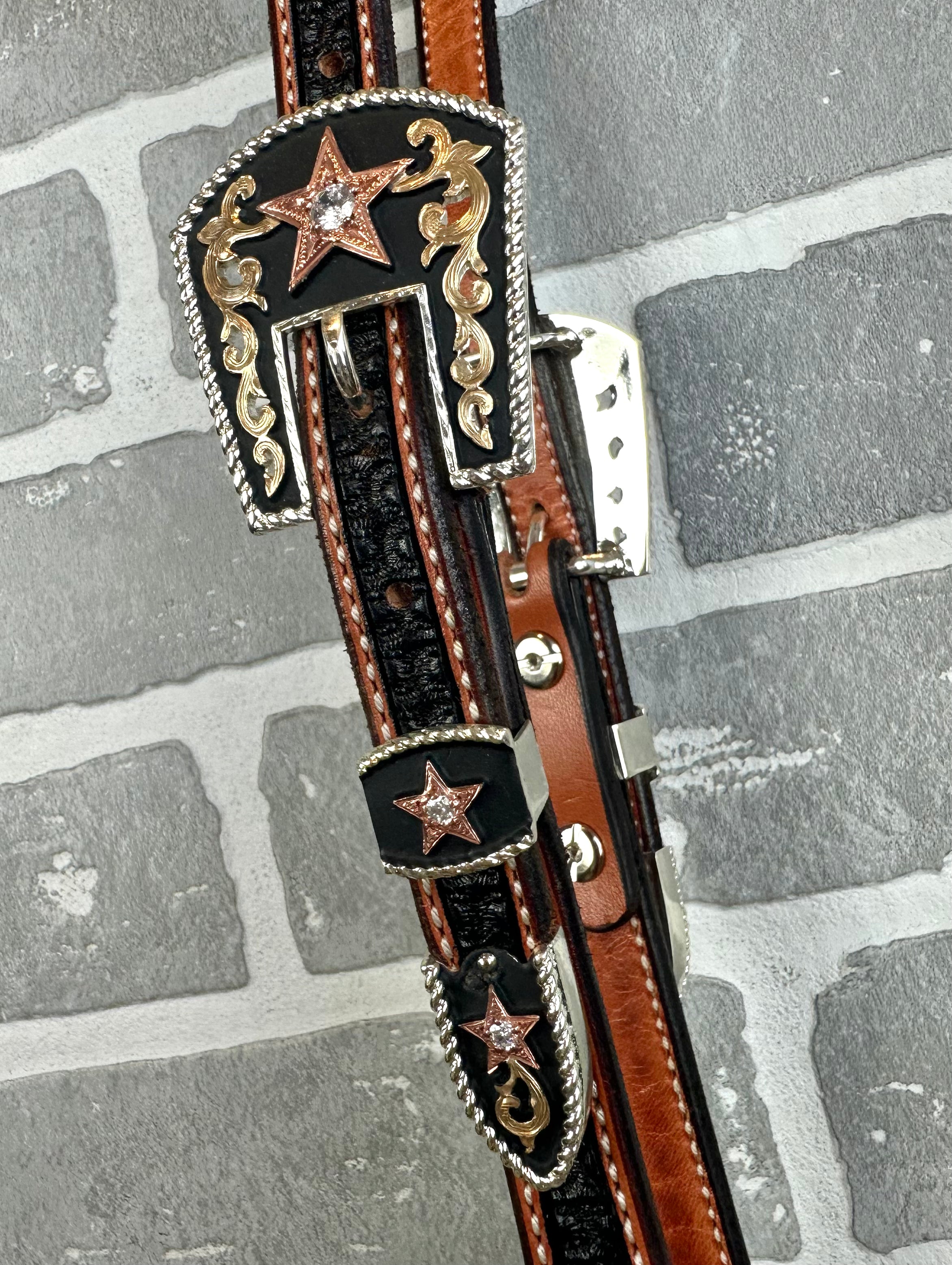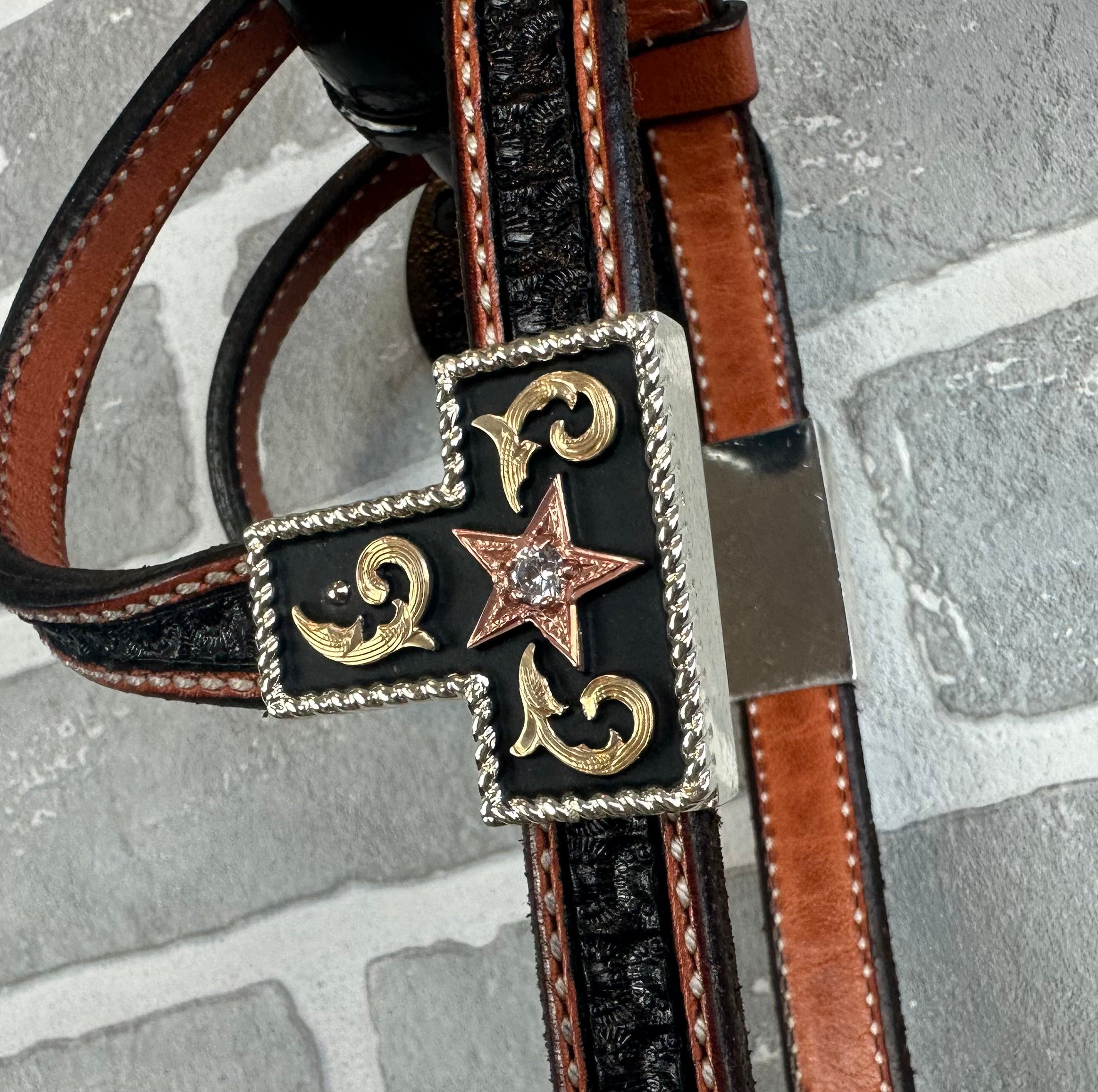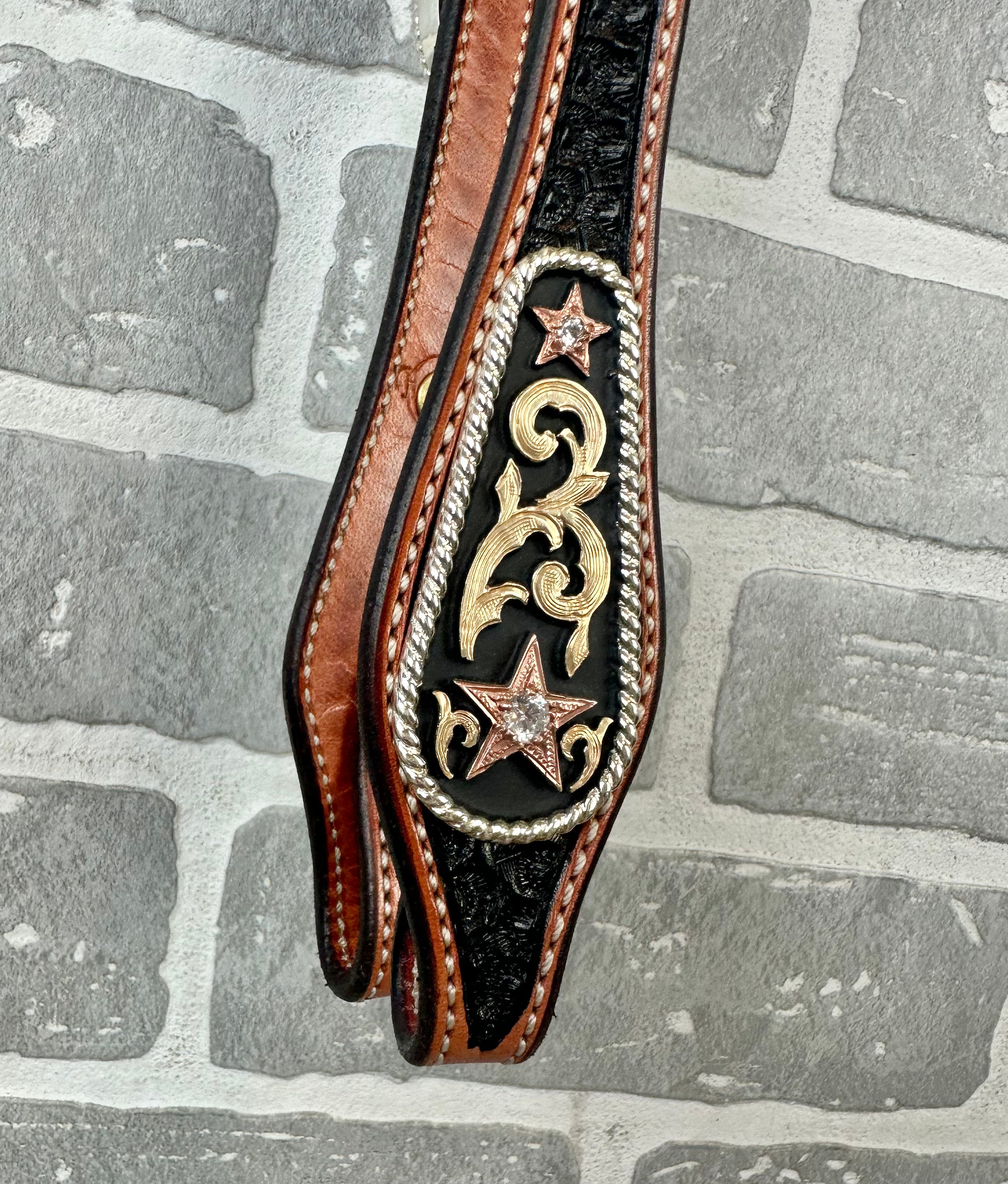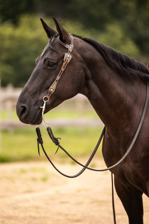 This gorgeous headstall is one of our own! Hand carved leather and custom silver is perfection, with Silver, Brass and Copper to add dimension! Made in the USA. Contact us with any questions; other color/stain options are available for the leather to help match saddles.