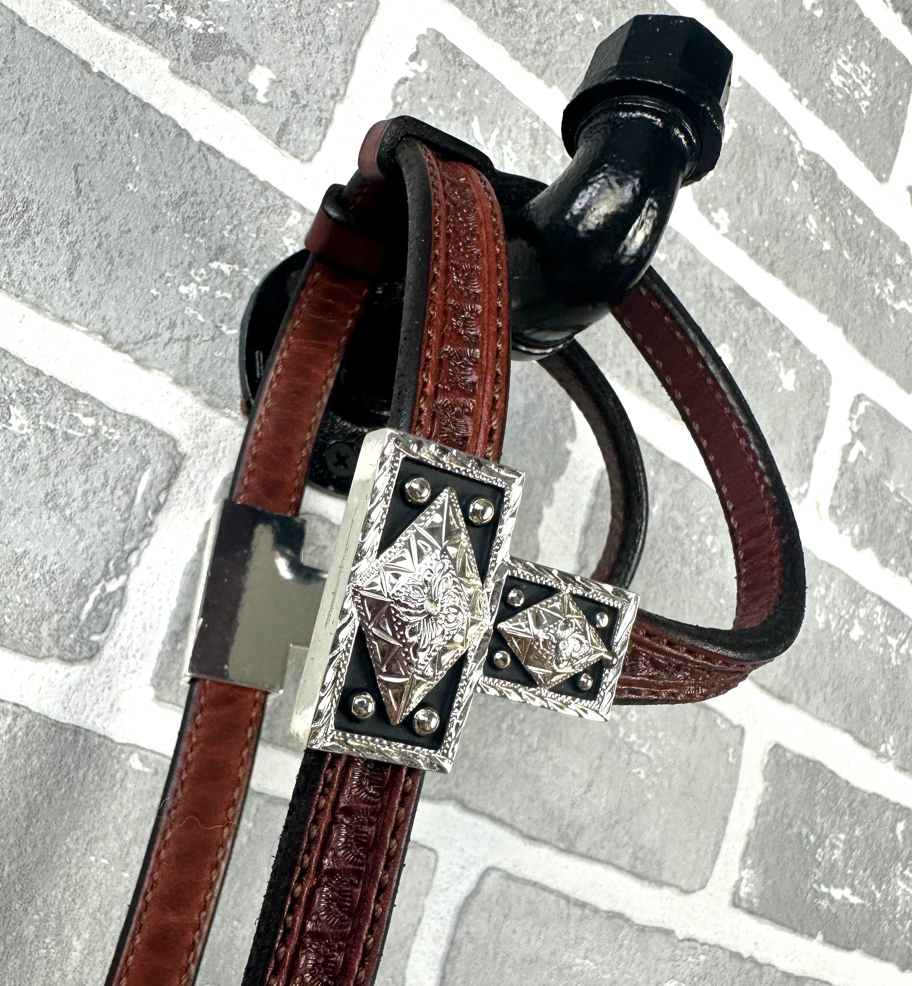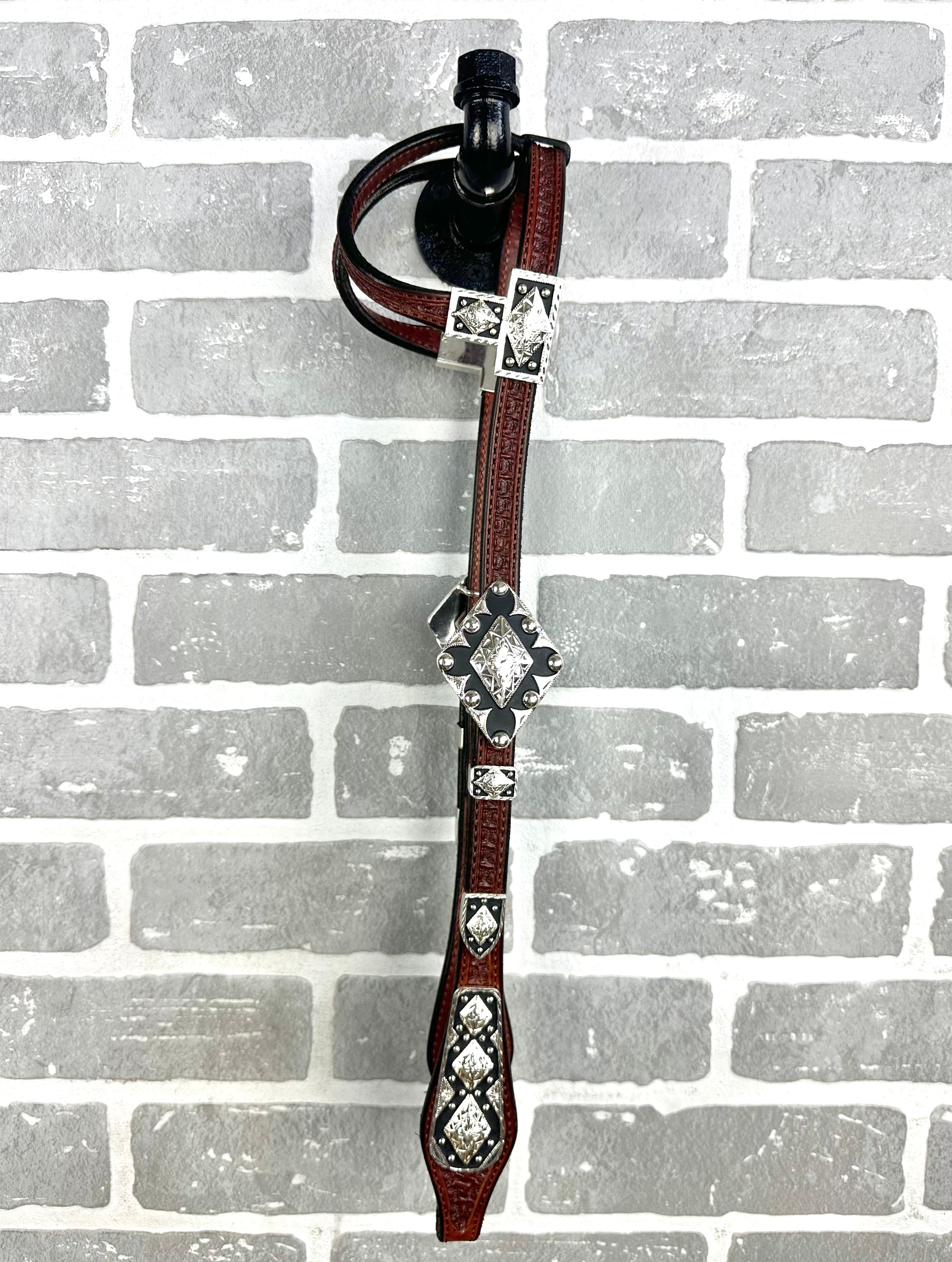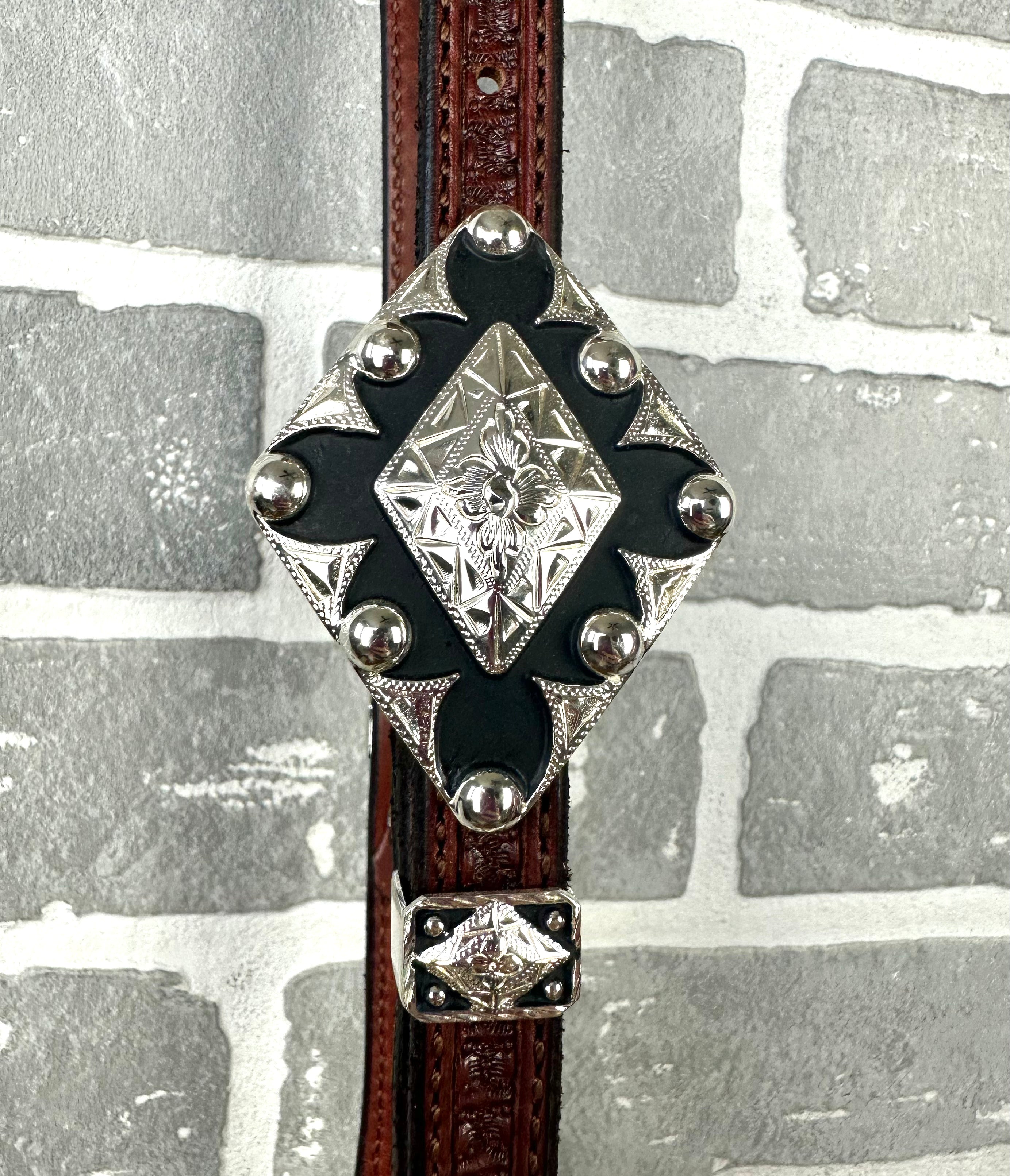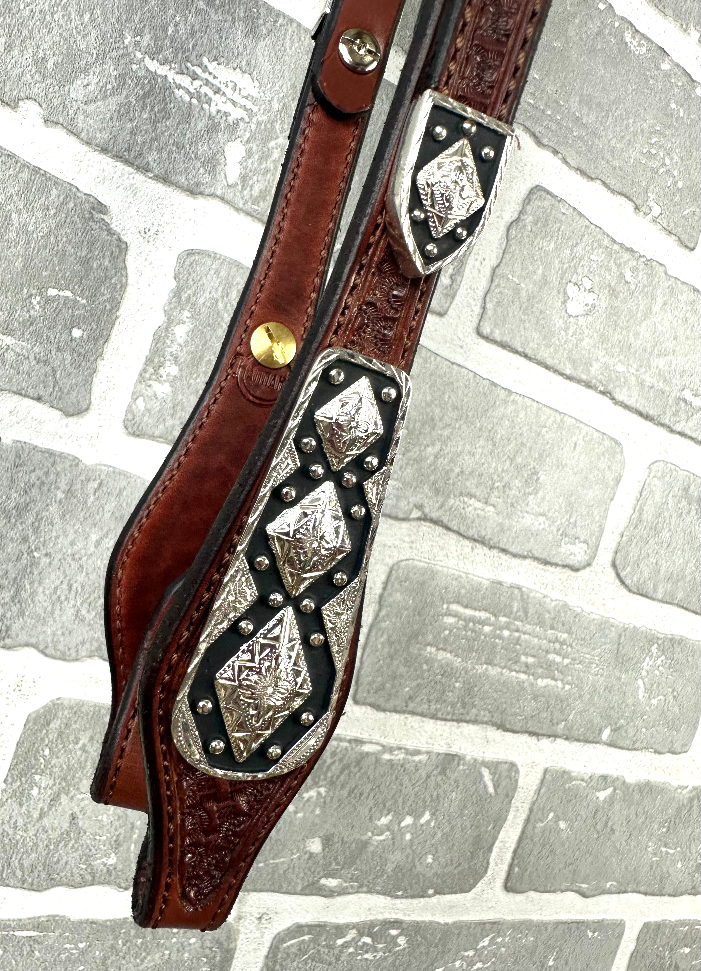 This gorgeous headstall is one of our own! Hand carved leather and custom silver is perfection, with Black and Silver diamond pattern to add dimension! Made in the USA. Contact us with any questions; other color/stain options are available for the leather to help match saddles.