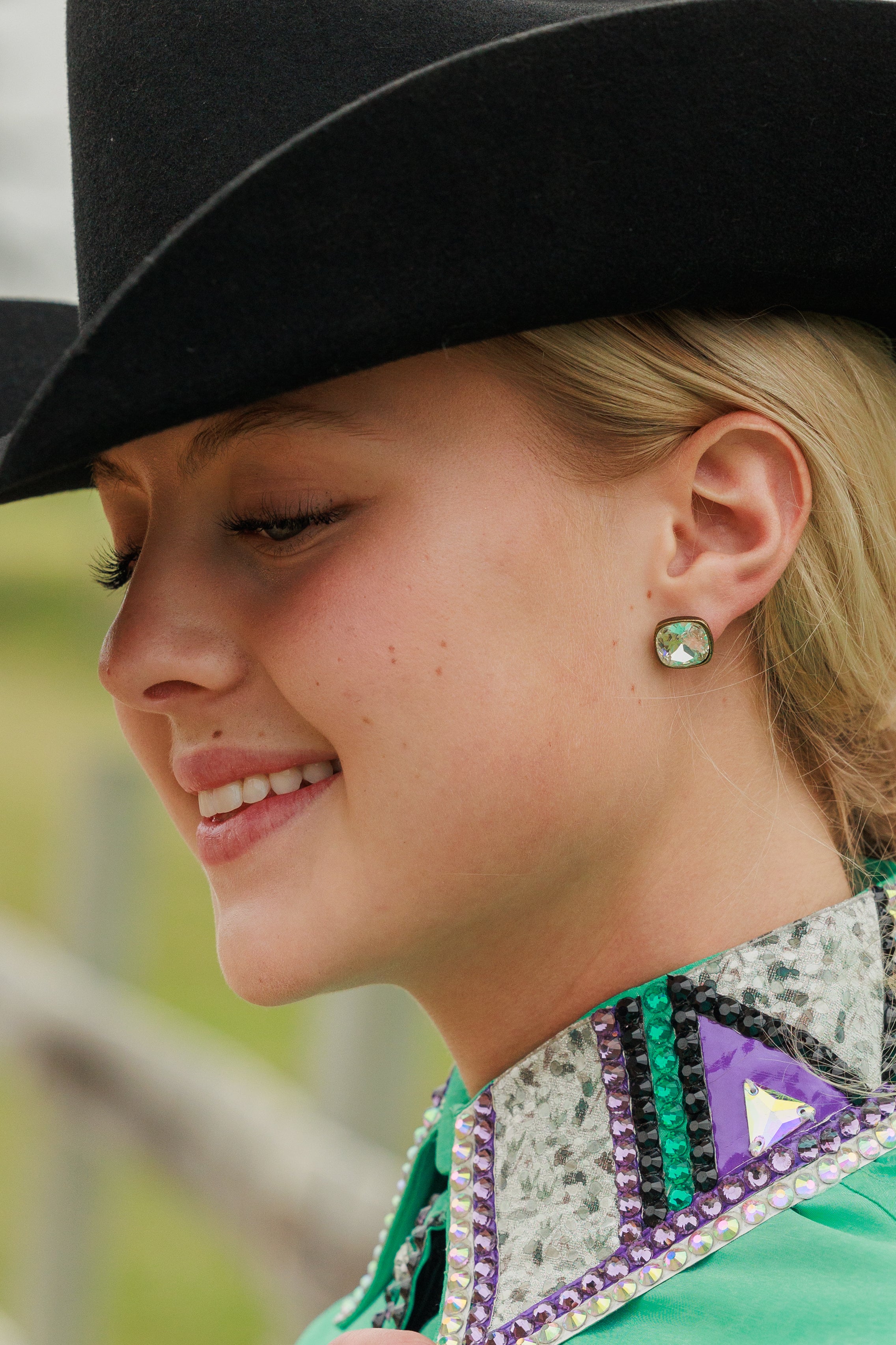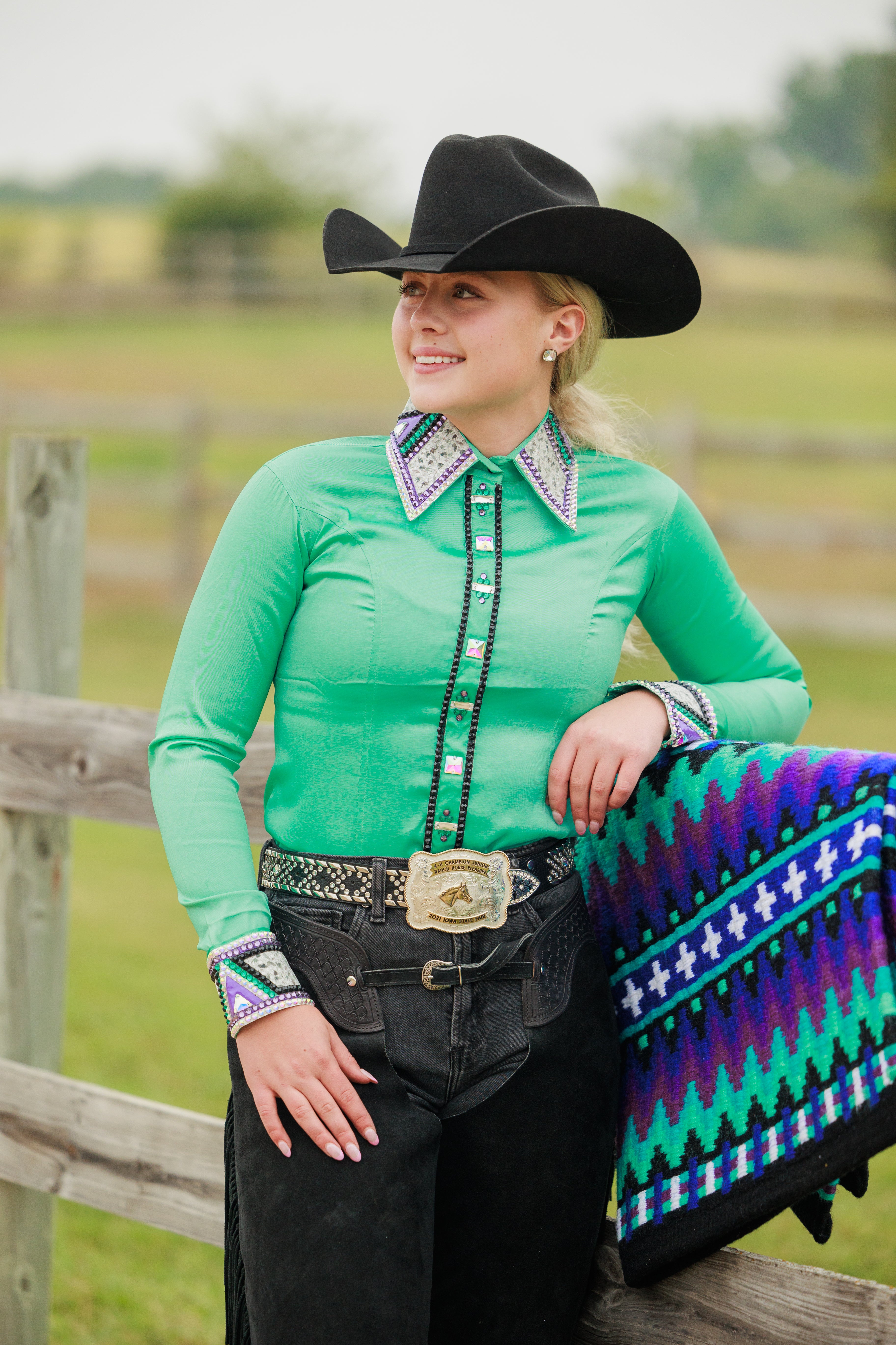 Looking to make a statement in the show arena? Our Ladies Bling Show Shirt in mint and purple is the perfect choice. Made to be form fitting, this shirt not only looks stunning but also allows for ease of movement during your performance. Perfect for showing in, this show shirt will definitely turn heads!