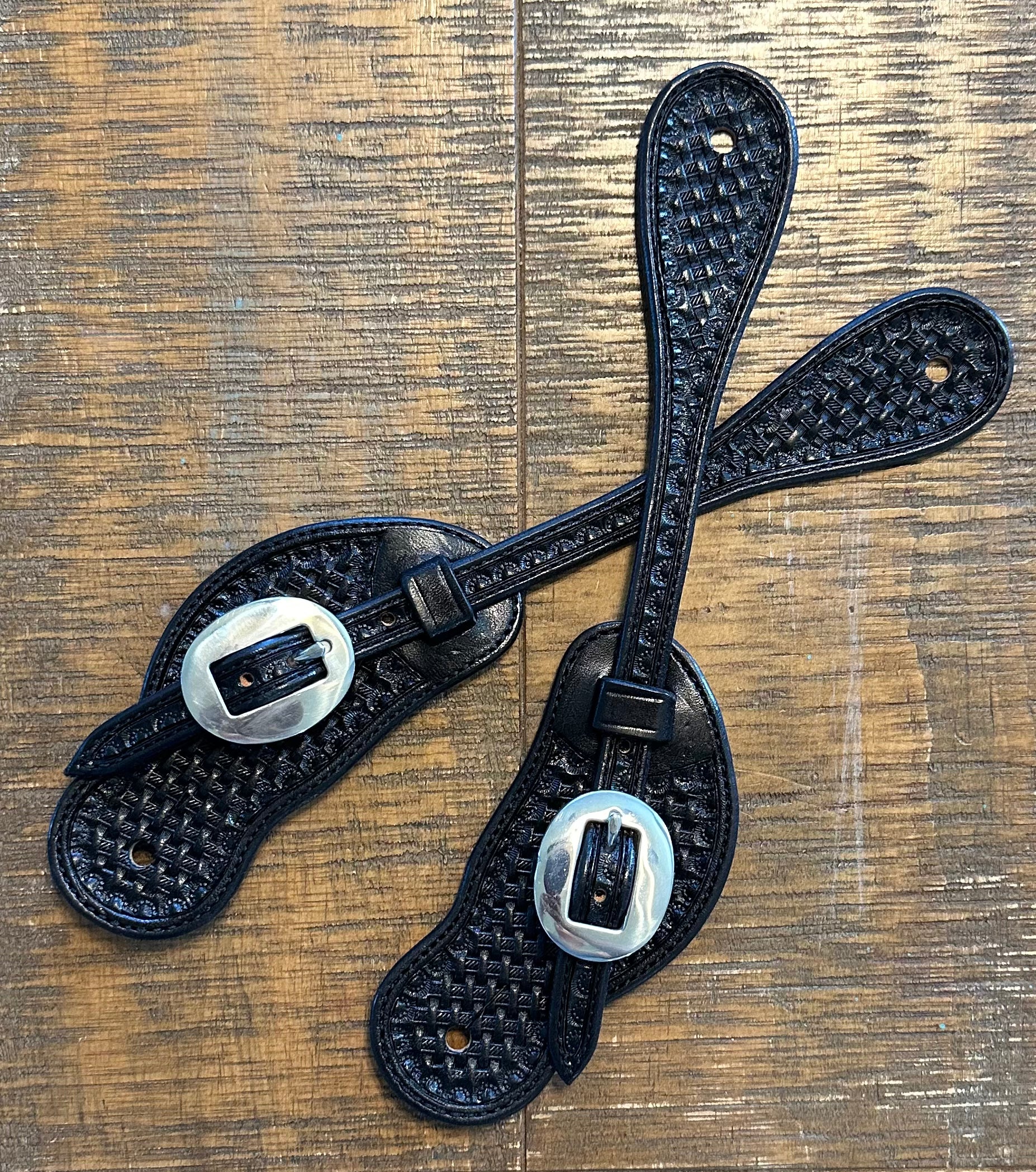These beautifully hand crafted spur straps have a basketweave pattern stamped by one of our own artists! The quality and craftsmanship is 2nd to none! This pair is black leather with stainless buckles and fits most sizes.