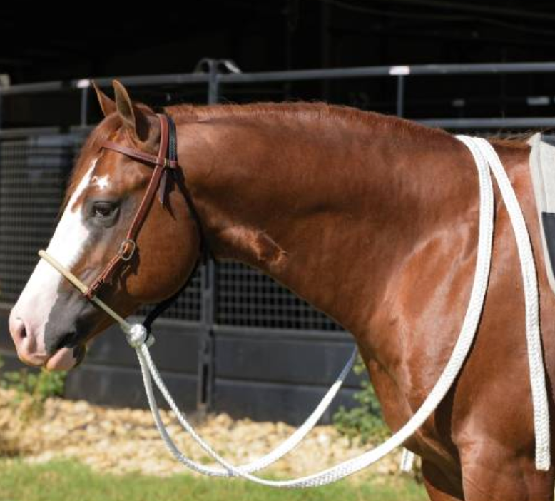5/8" Harness leather and lariat rope nose with braided rawhide wrap. Nickel plate hardware and cowboy laced buckles. White mule tape reins. Harness Leather is made for strength, durability and heavy use by the addition of oils and tallows in the tanning process. Our harness leather products are carefully edged, hand rubbed and finished with our unique heavy oil dressing to provide a quality look and years of service.