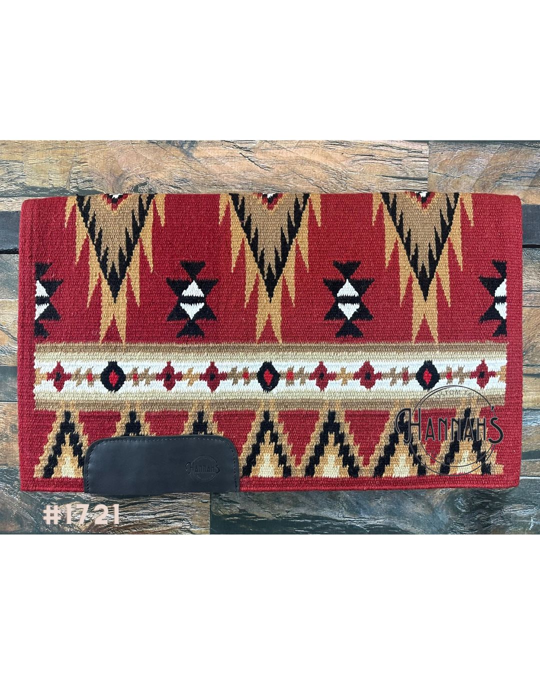 Our custom Ranch pads are hand made with a tight weave that measures 34x40 in size, weighing approximately 5-6 pounds, 1/2” thick, and stamped wear leathers that are sown on. Each of these show pads also comes with a FREE zipper case. This pad features a Brick Red base with shades of Tan, Black and White within the pattern.