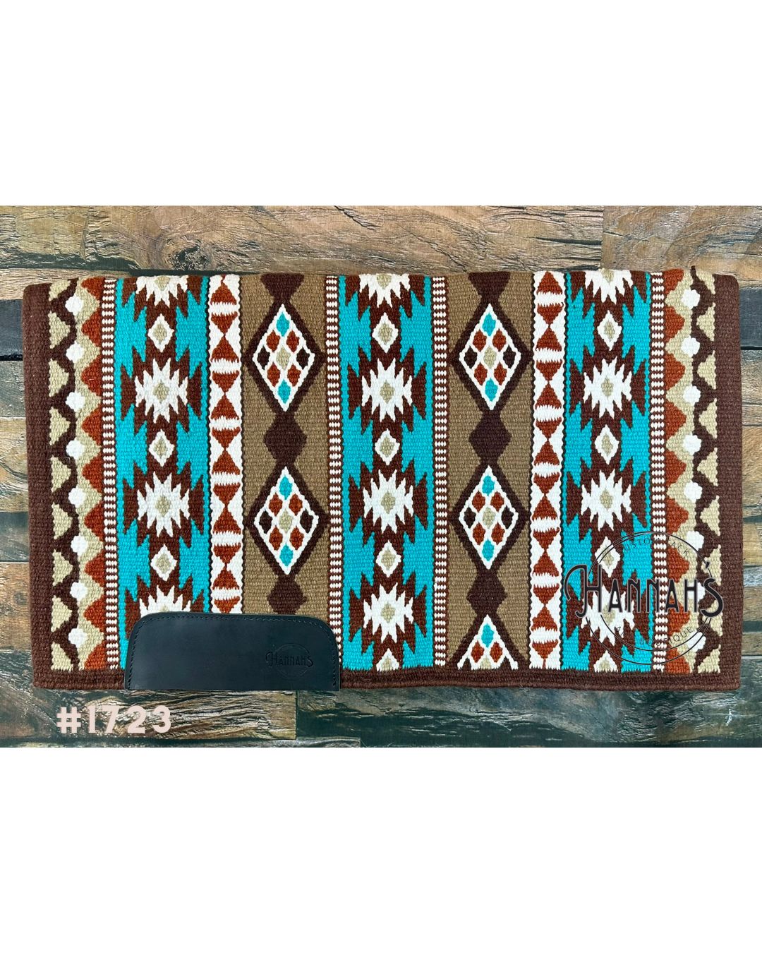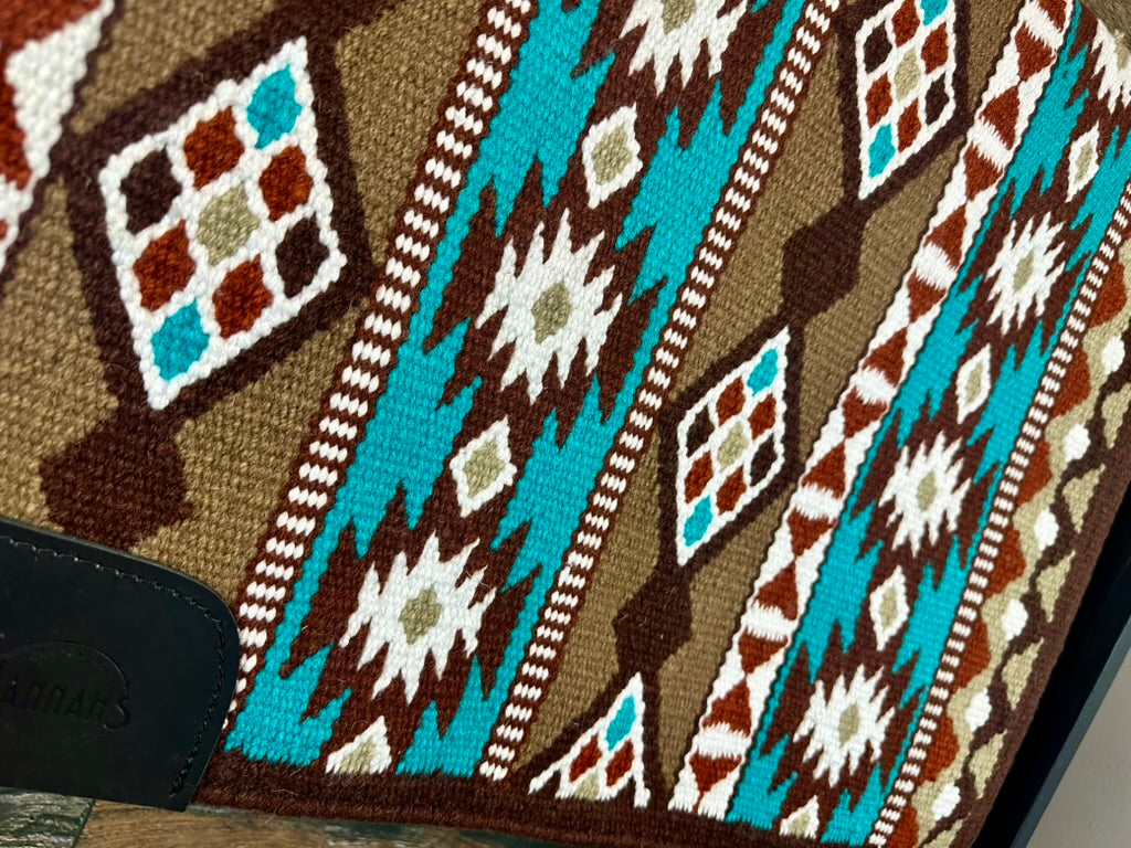 Our custom Ranch pads are hand made with a tight weave that measures 34x40 in size, weighing approximately 5-6 pounds, 1/2” thick, and stamped wear leathers that are sown on. Each of these show pads also comes with a FREE zipper case. This pad features a Chocolate base with shades of Tan, Sand Turquoise, Rust and White within the pattern.