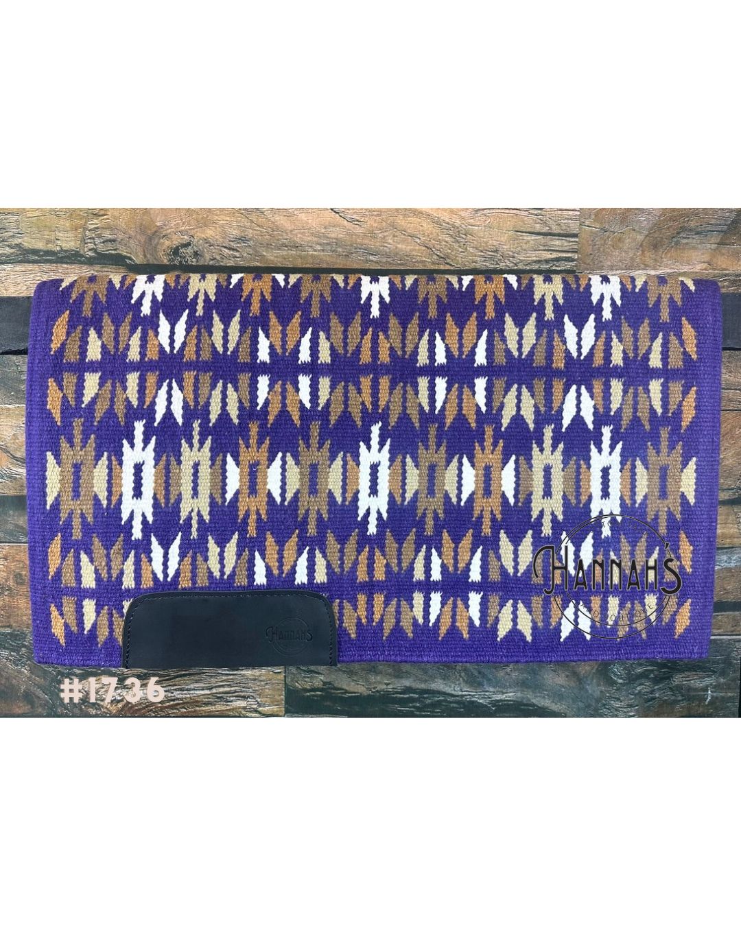 Our custom Ranch pads are hand made with a tight weave that measures 34x40 in size, weighing approximately 5-6 pounds, 1/2” thick, and stamped wear leathers that are sown on. Each of these show pads also comes with a FREE zipper case. This pad features a Purple base with shades of Tans, Sand and White within the pattern.