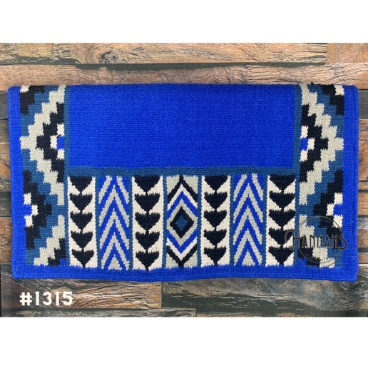Our custom Ranch pads are hand made with a tight weave that measures 32x40 in size, weighing approximately 7 lbs, 1/2” thick, and stamped wear leathers that are sown on. Each of these show pads also comes with a FREE clear zipper case. This pad has a Royal base with black, more royal, and ash in the pattern.