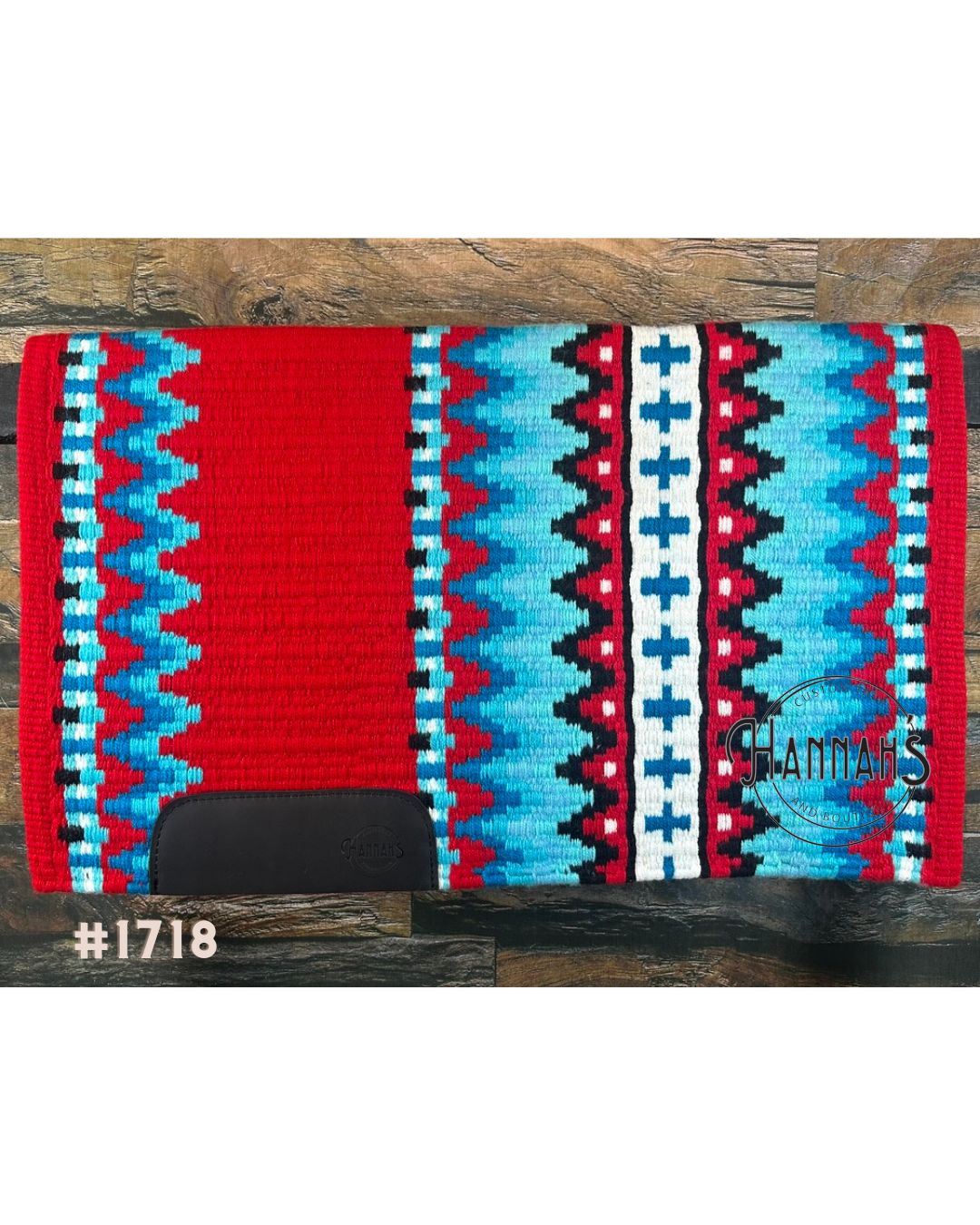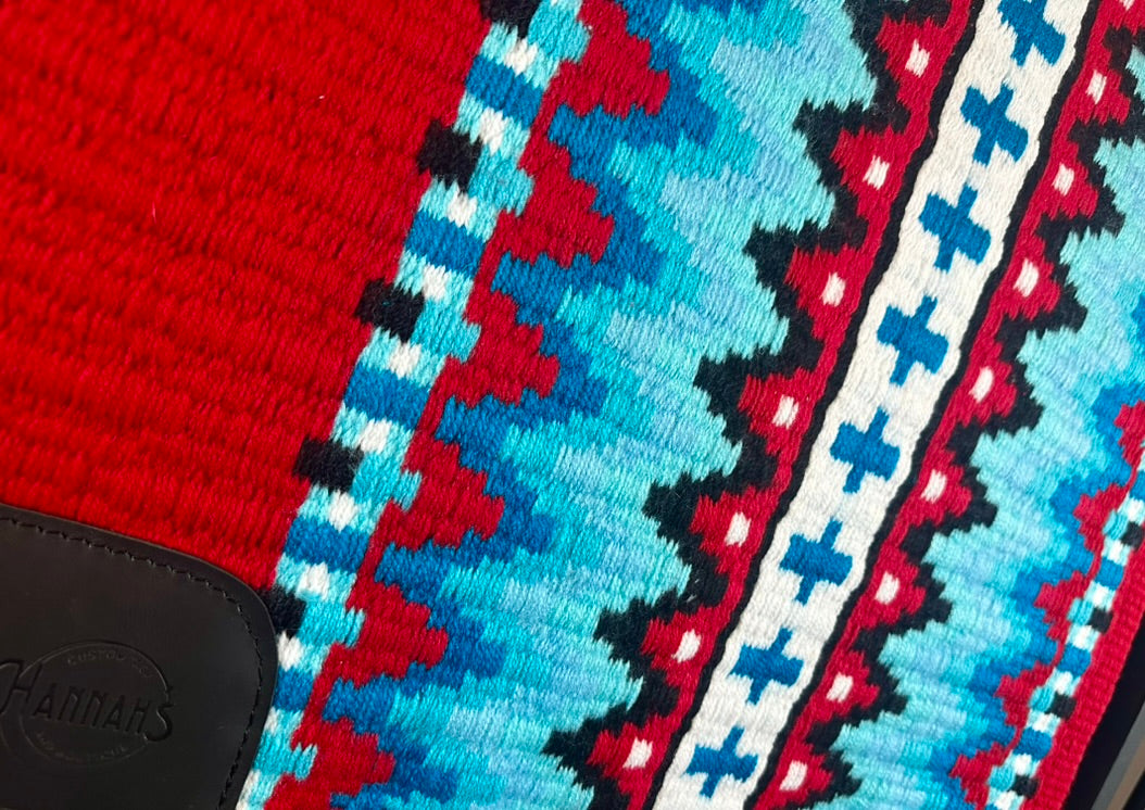Our custom Show pads are hand made with a tight weave that measures 34x42 in size, weighing approximately 7.5-9 lbs, and stamped wear leathers that are sown on. Each of these show pads also comes with a FREE clear zipper case. This pad features a Red base, with shades of Turquoise, Aqua, Black and White within the pattern.