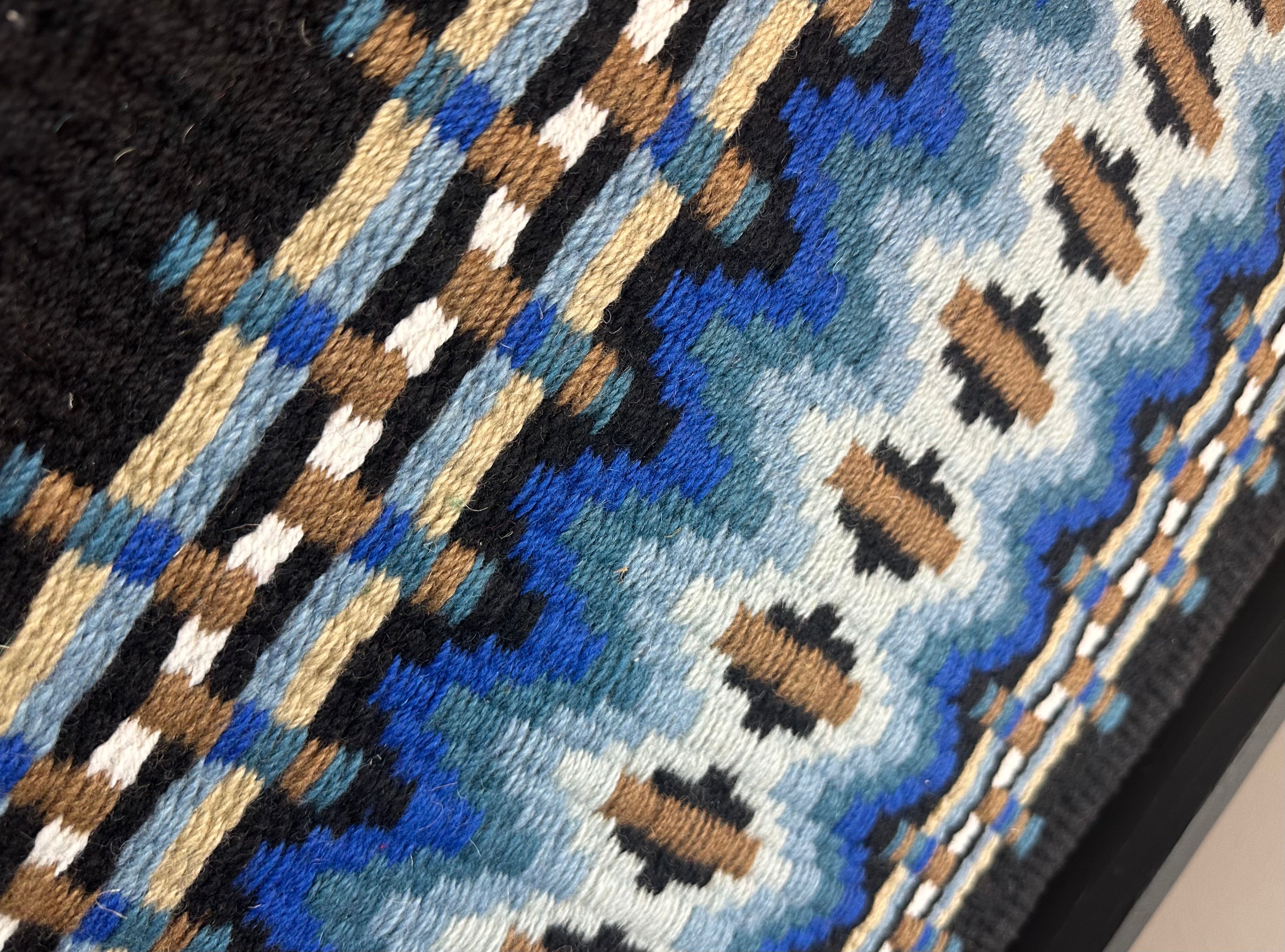 Our custom Show pads are hand made with a tight weave that measures 34x42 in size, weighing approximately 7.5-9 lbs, and stamped wear leathers that are sown on. Each of these show pads also comes with a FREE clear zipper case. This pad features a Black base, with shades of Blue, Tans and White within the pattern.