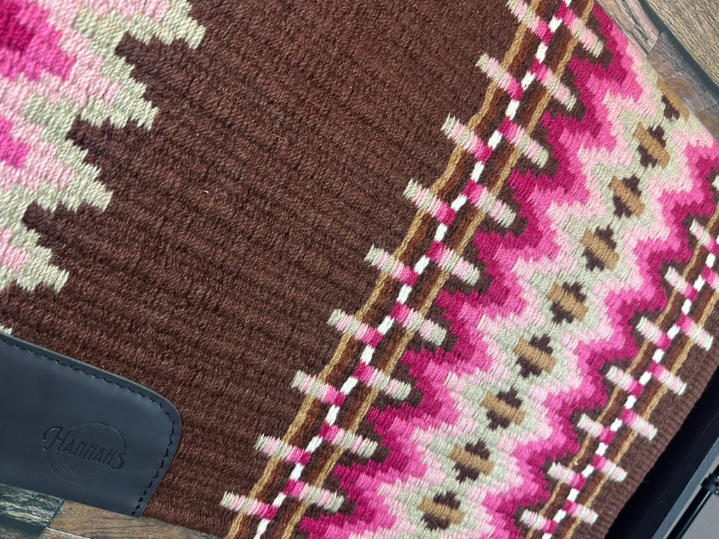 Our custom Show pads are hand made with a tight weave that measures 34x42 in size, weighing approximately 7.5-9 lbs, 3/4” thick, and stamped wear leathers that are sown on. Each of these show pads also comes with a FREE clear zipper case. This pad features an Chocolate base, with shades of Raspberry, soft Green and White within the pattern.