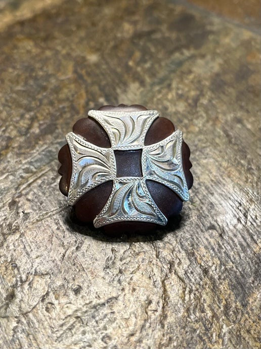 This beautiful 1 1/2" slide has a rustic base with antique overlay. A great contrast between the two colors and textures. Perfect for dressing up any wild rag.